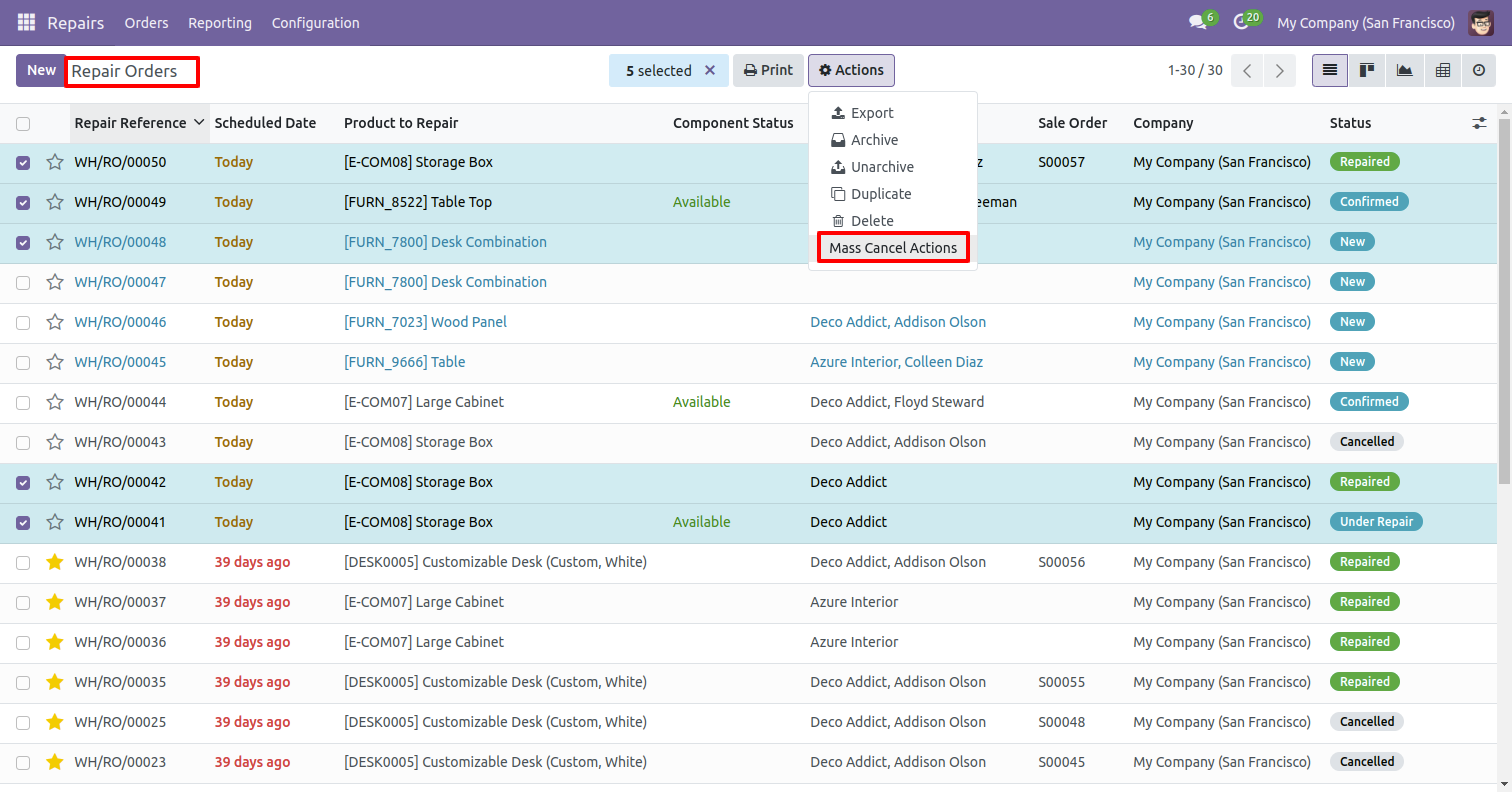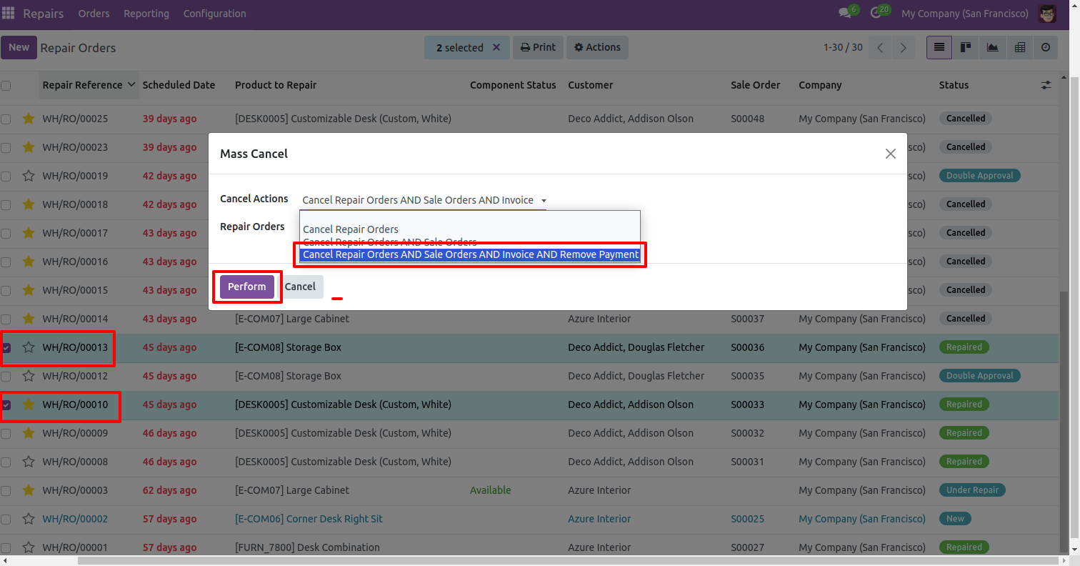 Select the repair order and click on the 'Mass Cancel Actions' from thr actions.
