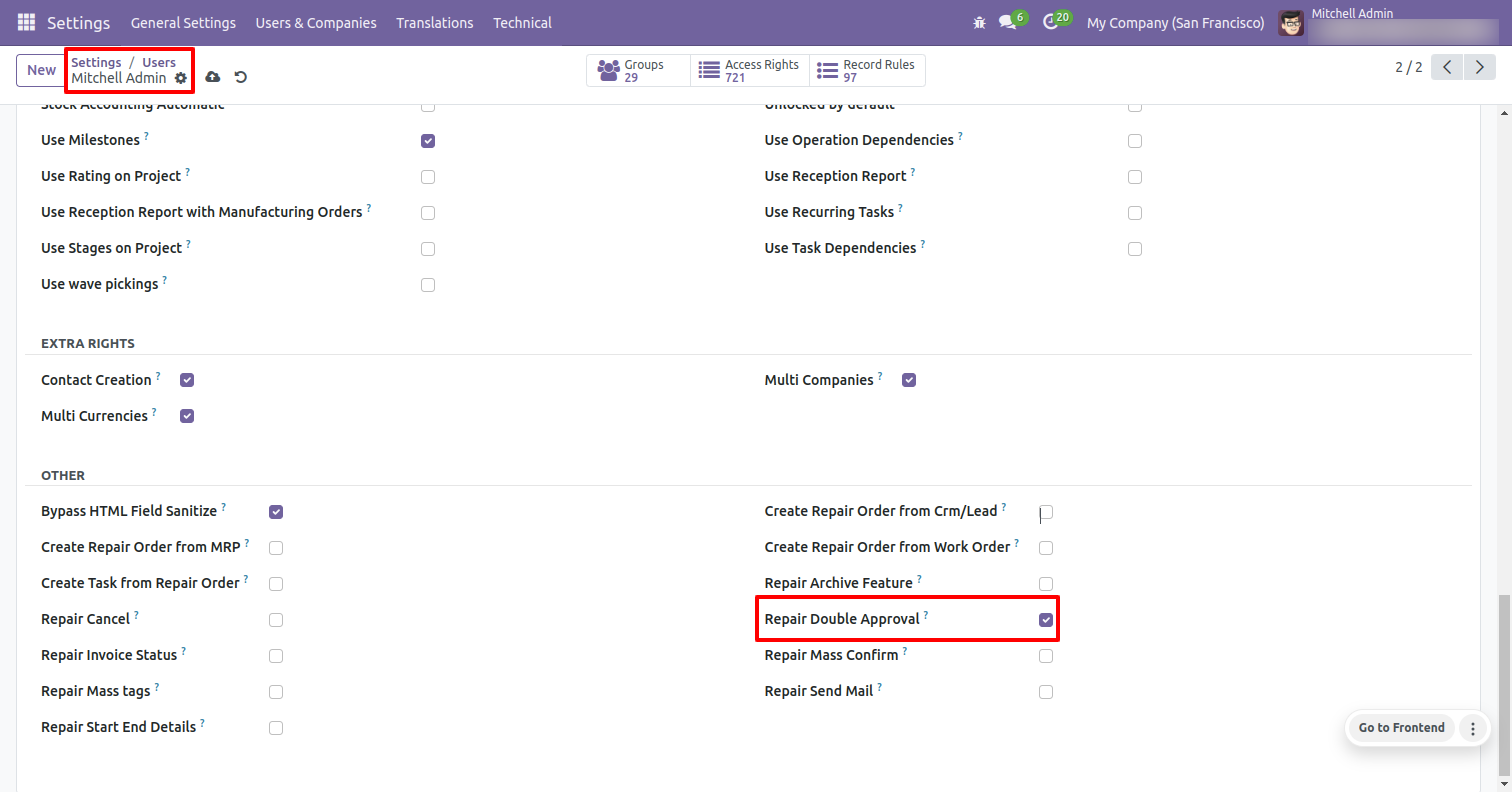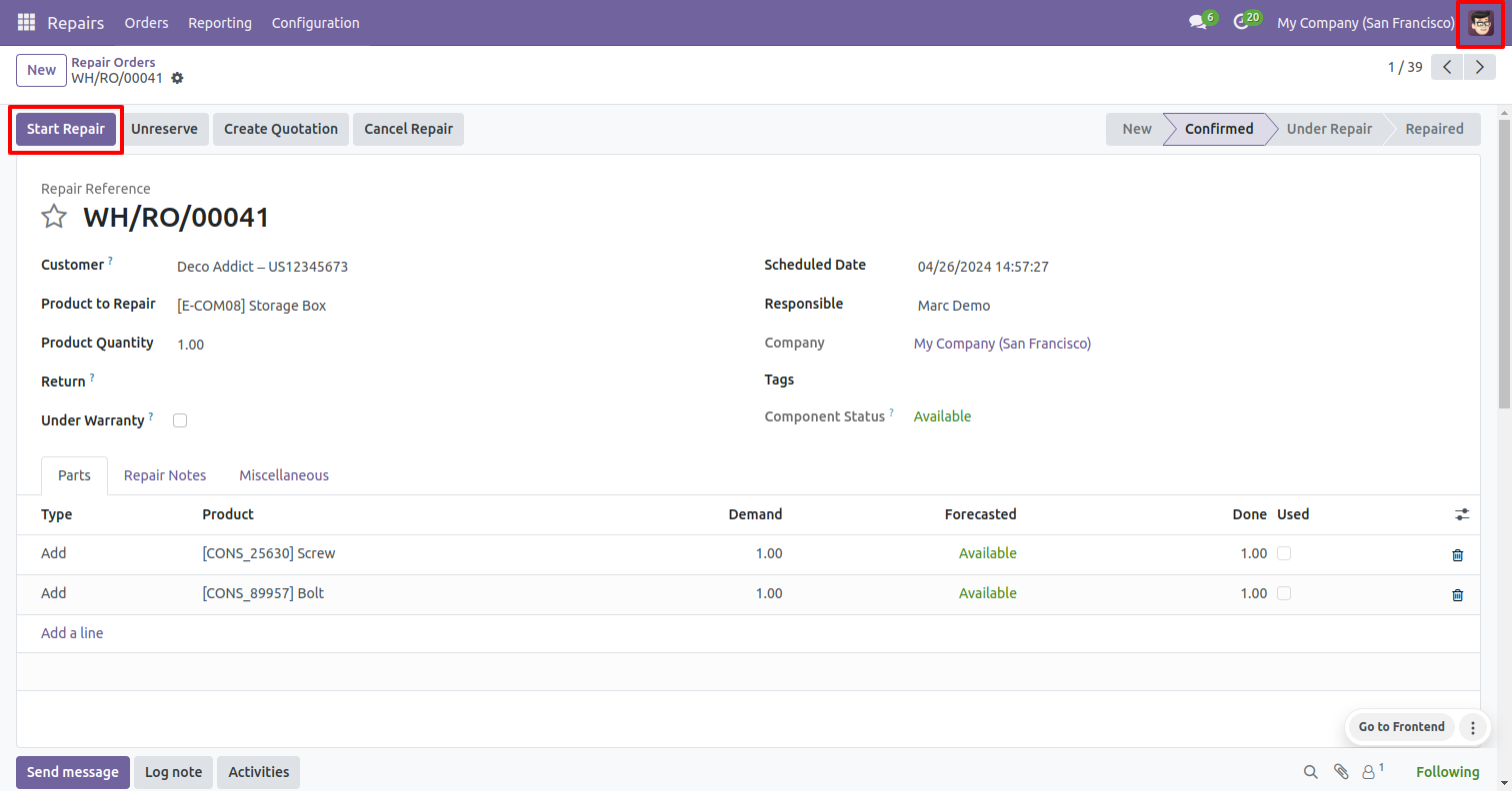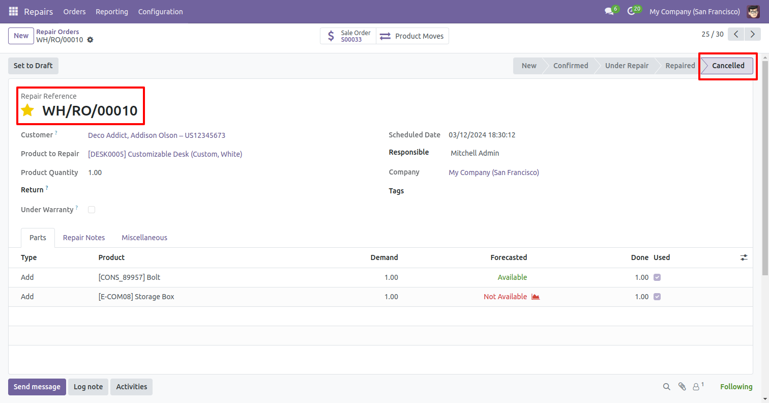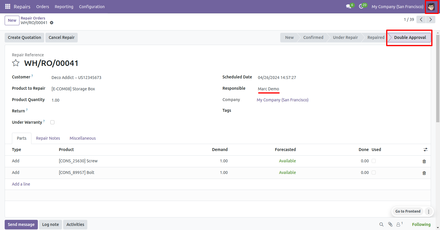 Click on the 'Approve' button to approve the repair order. Approval user can also cancel it by clicking the 'Cancel Repair' button.