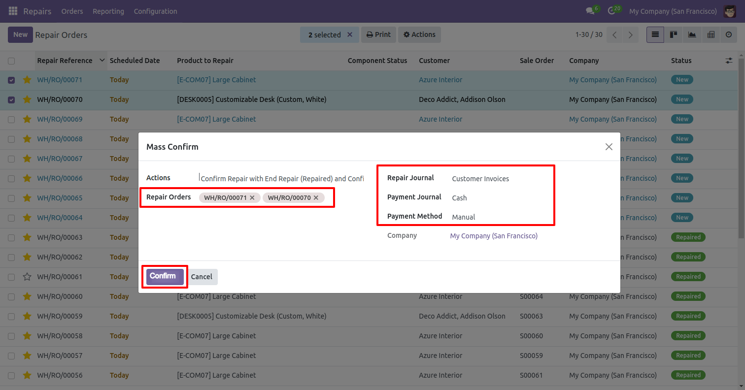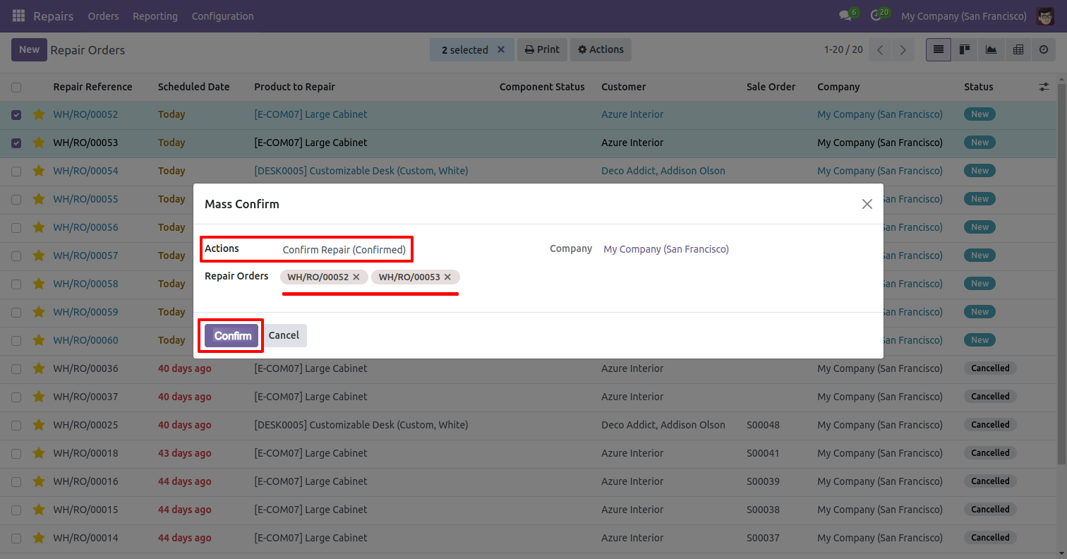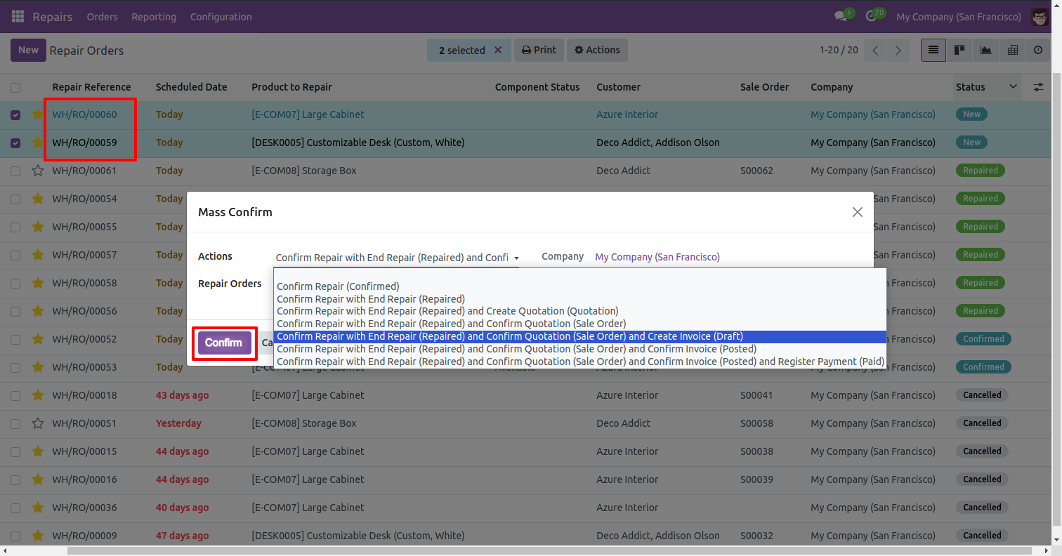 Select the repair orders and click on the 'Mass Confirm Actions' from the Actions.