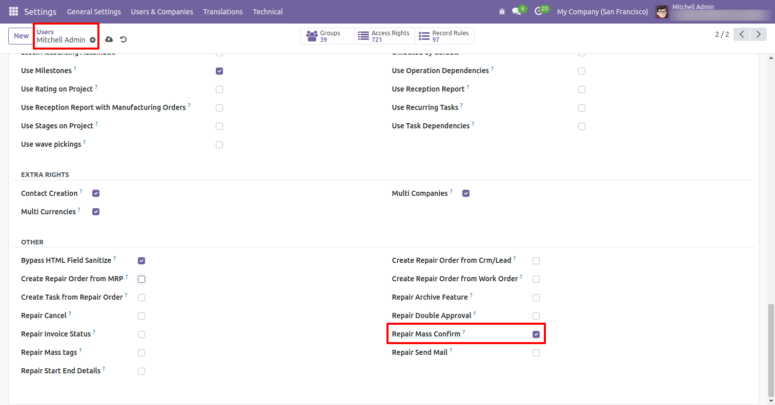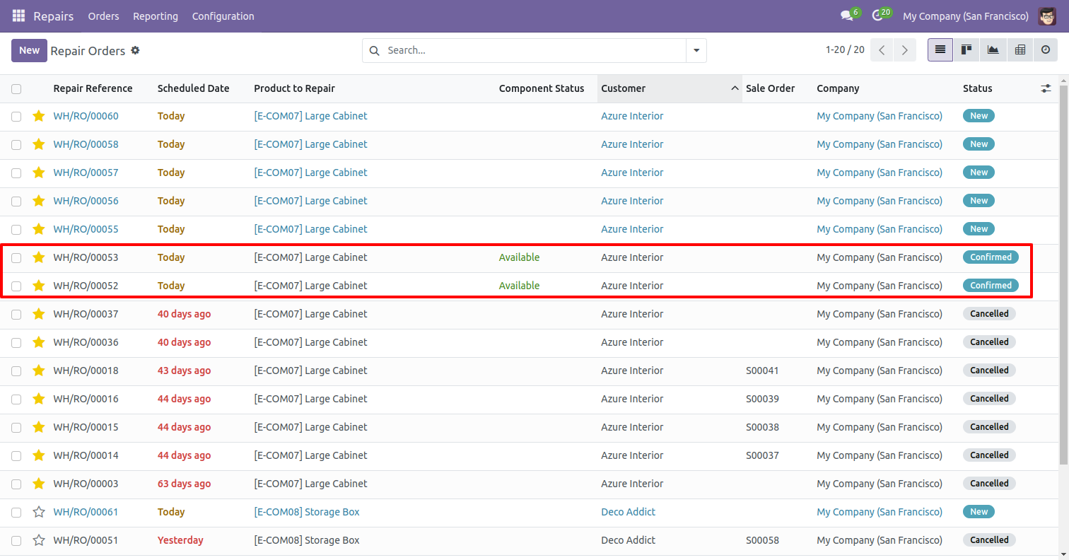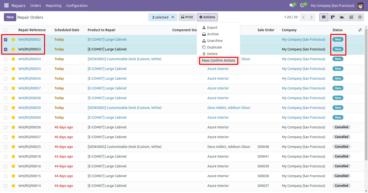 Select the repair orders and click on the 'Mass Confirm Actions' from the Actions.