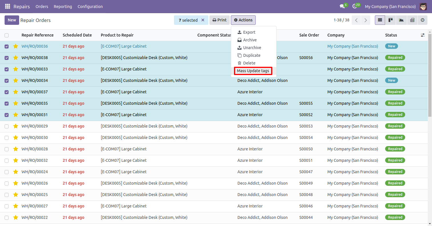 Select the repair orders and click on the 'Mass Update Tags' from the Actions.