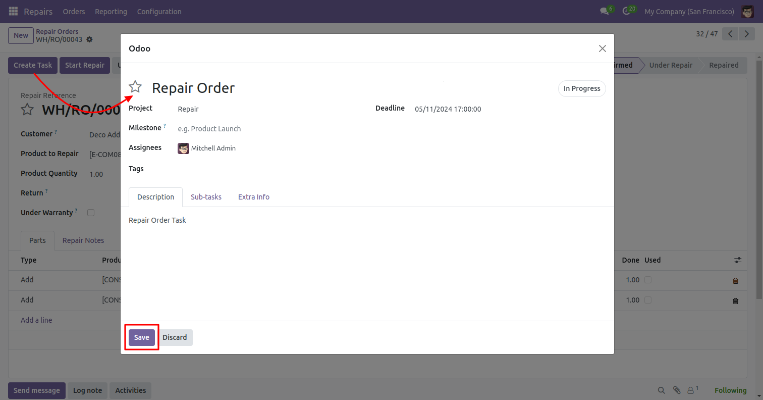 In the Repair Orders form view, click on the 'Create Task' button to generate a new task.