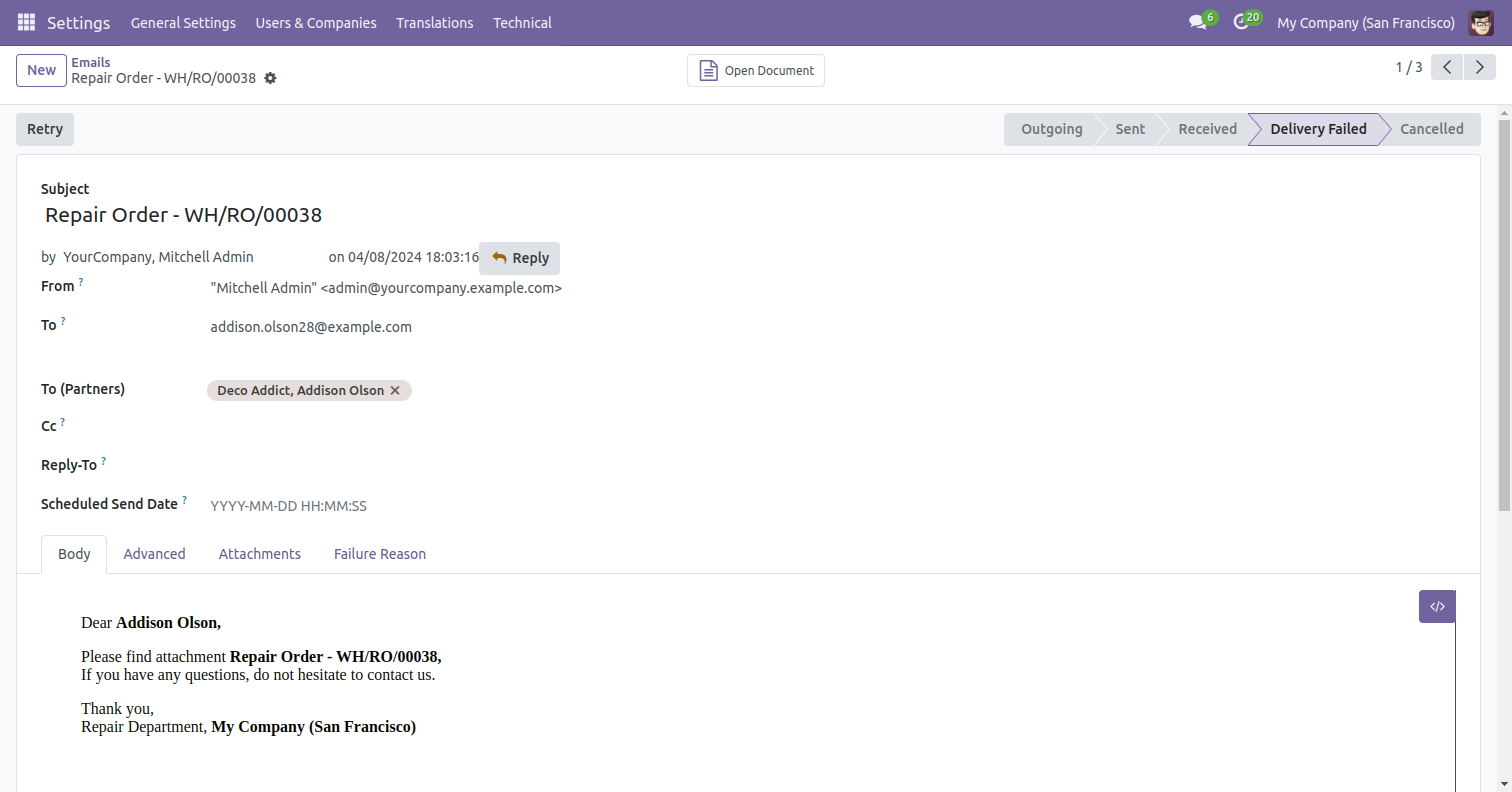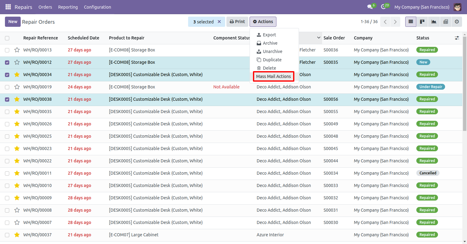 Select the repair orders and click on the 'Mass Mail Actions' from the actions.
