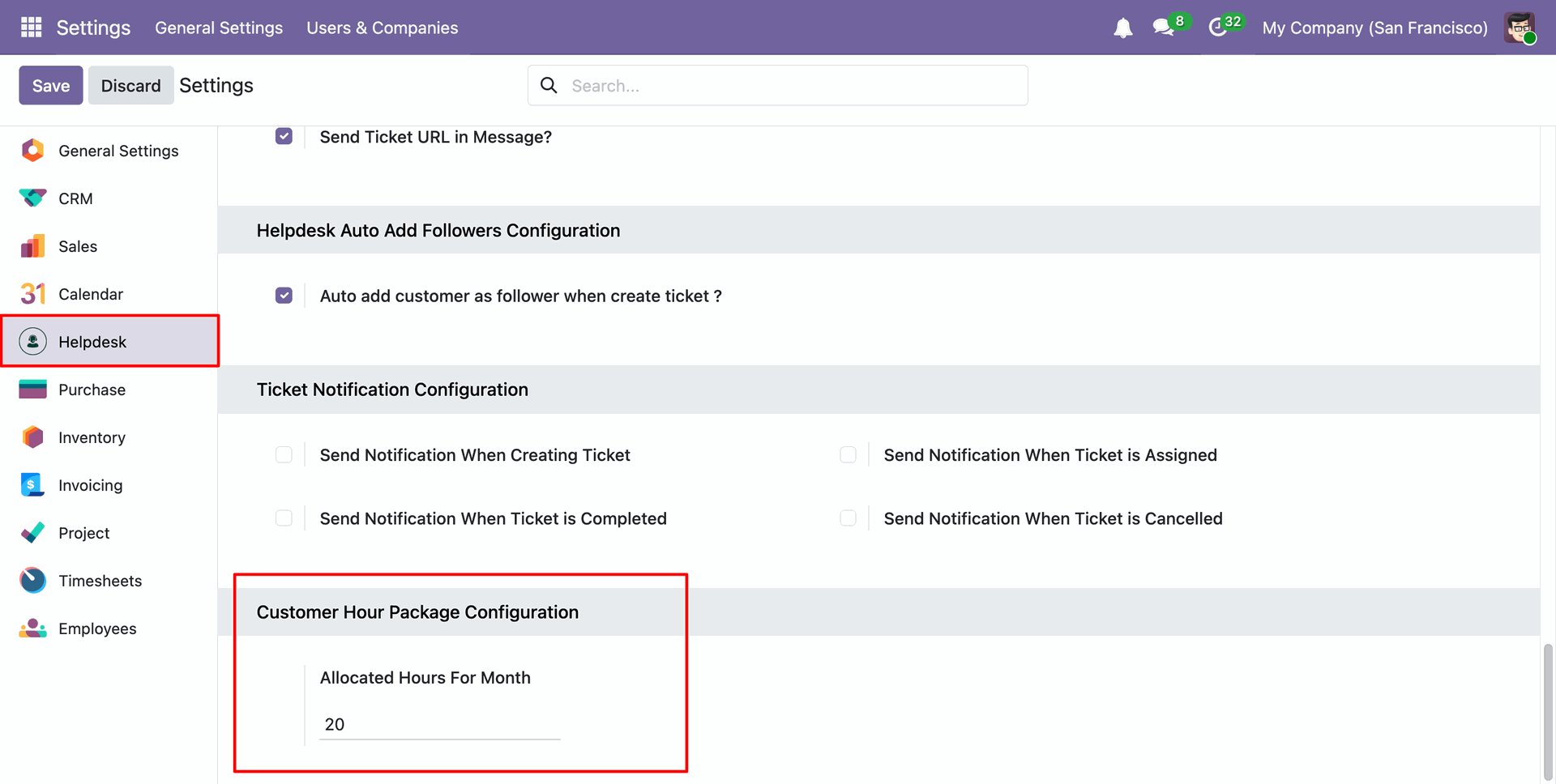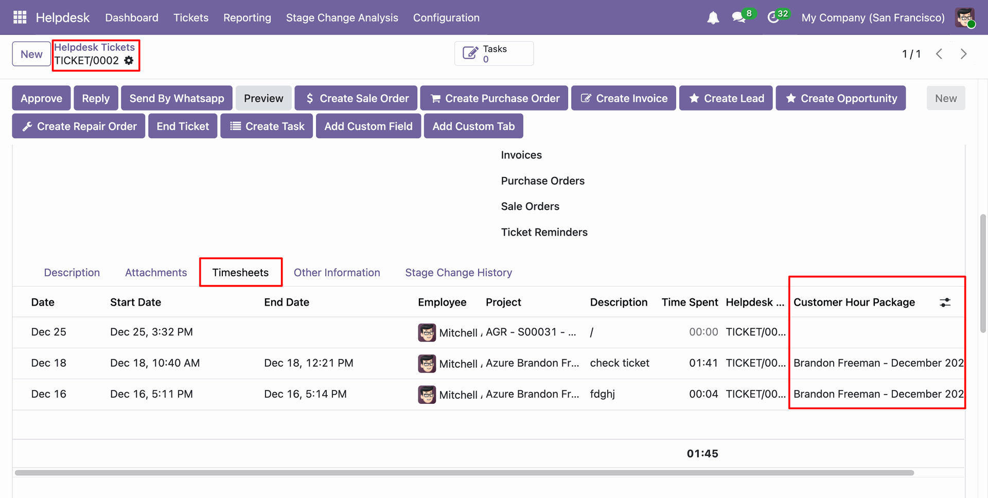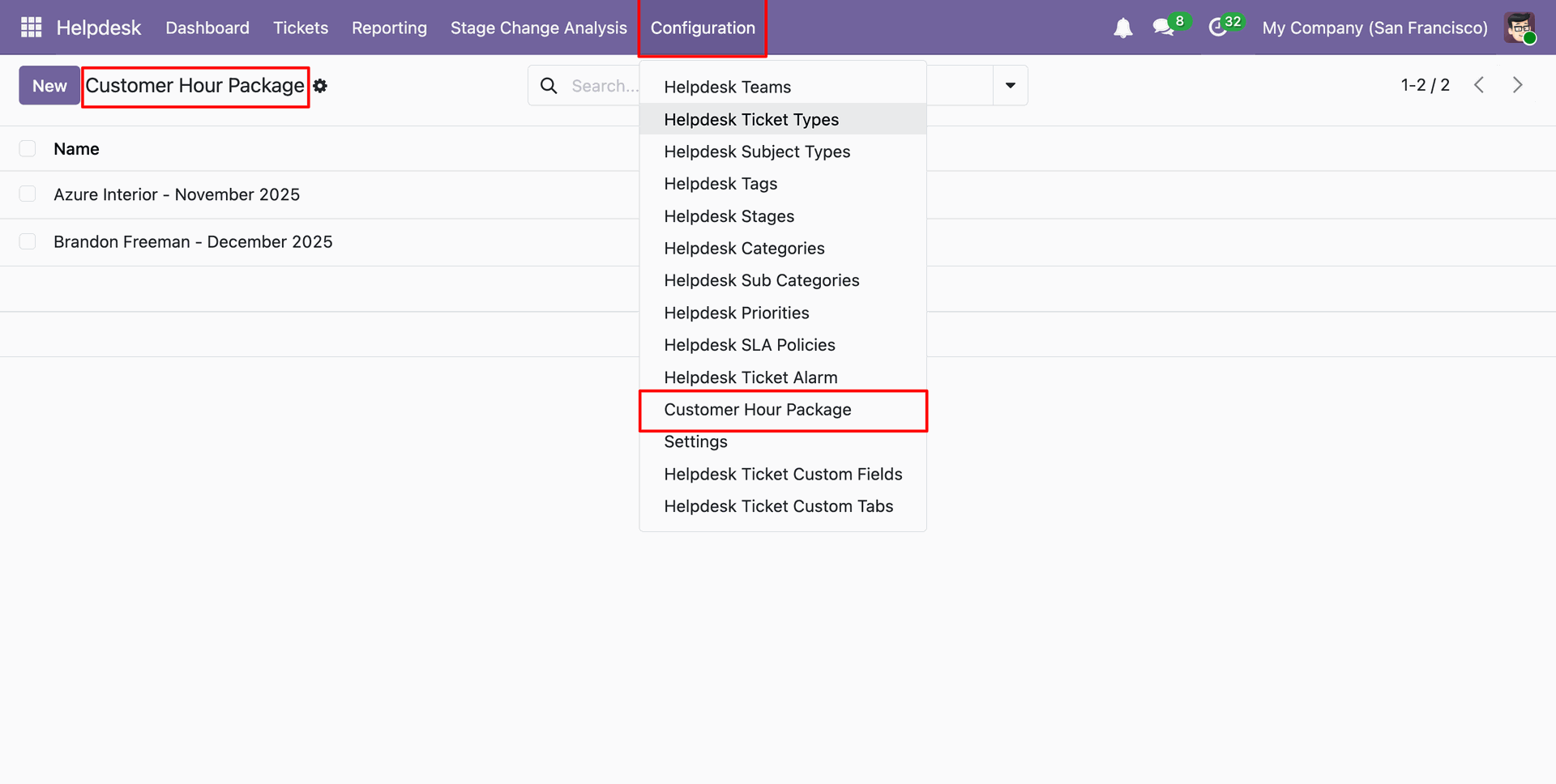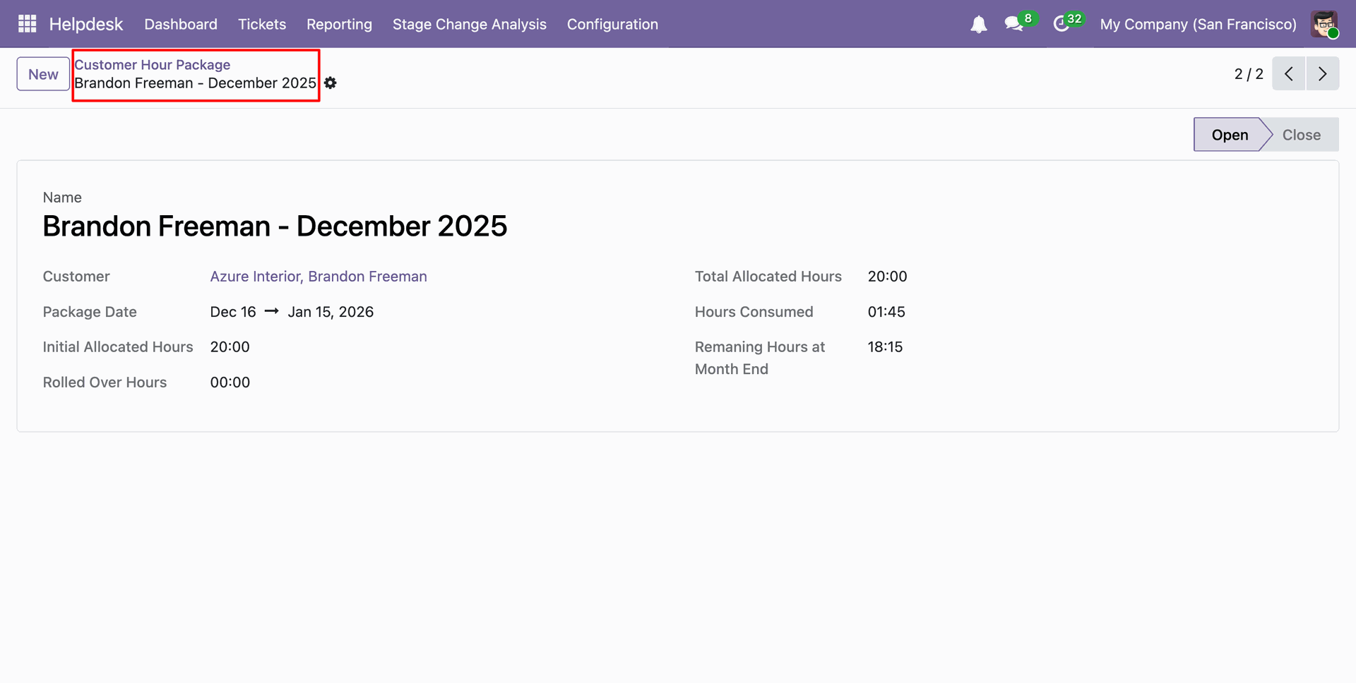 You can view the package date in the 'Customer Hour Package' form view, and the package is now in the closed stage.