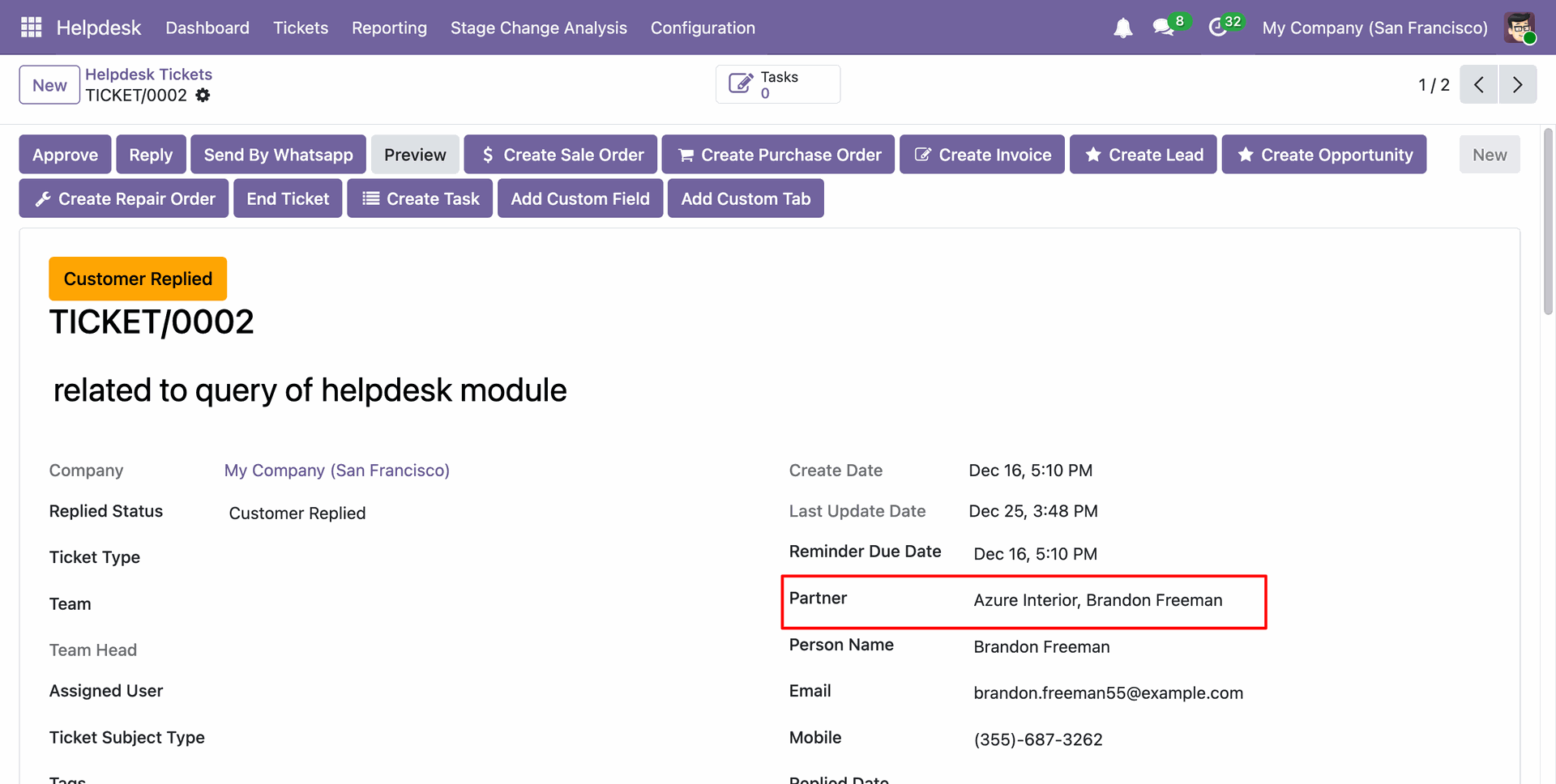 Here you can see the created ticket's form view.