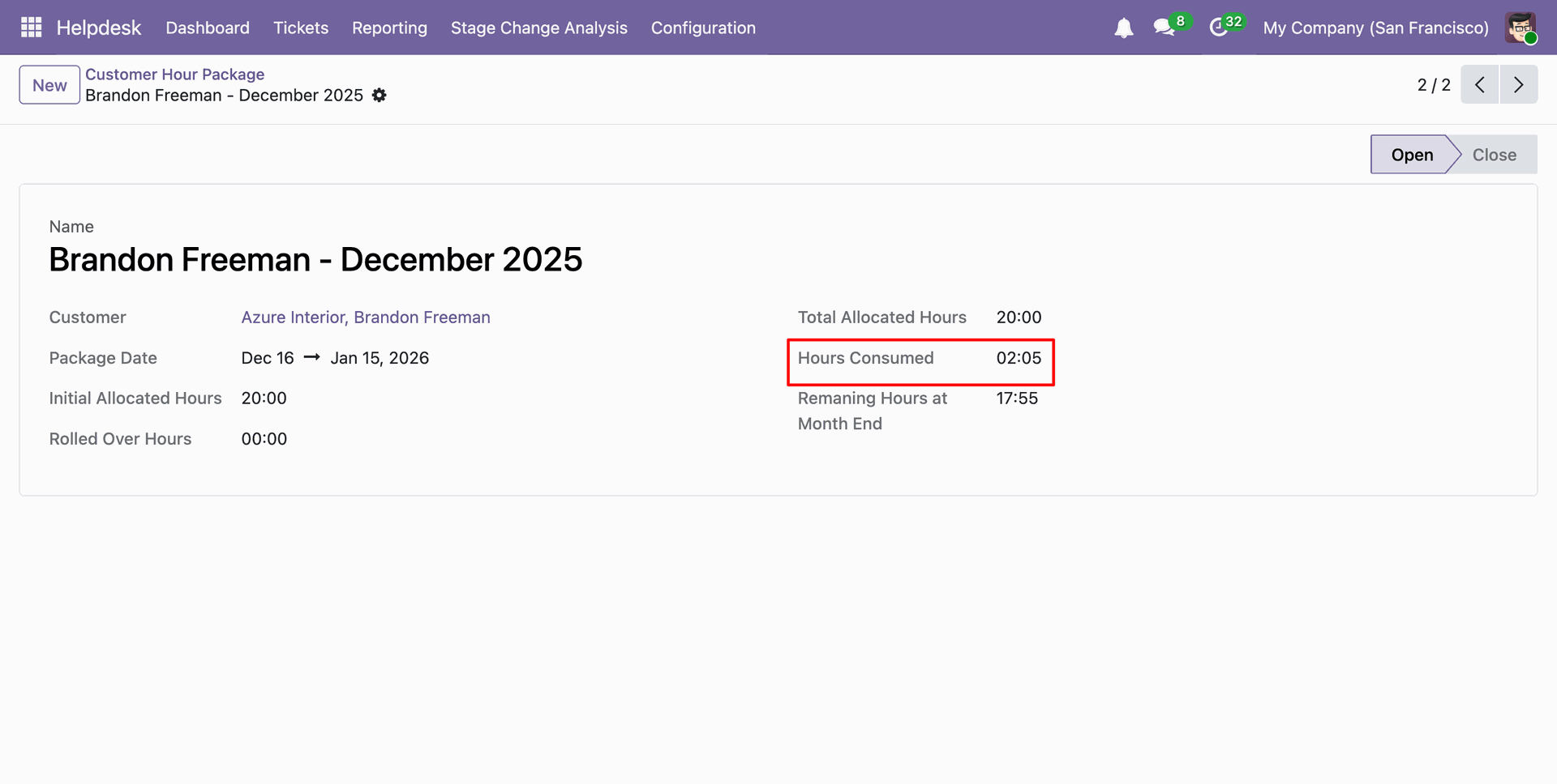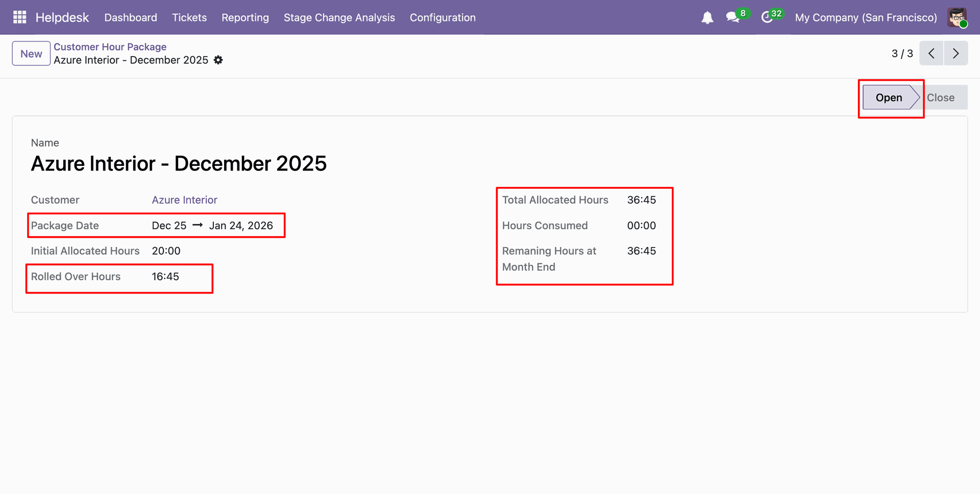 Form view of the 'Customer Hour Package', the package is now in the Open stage.