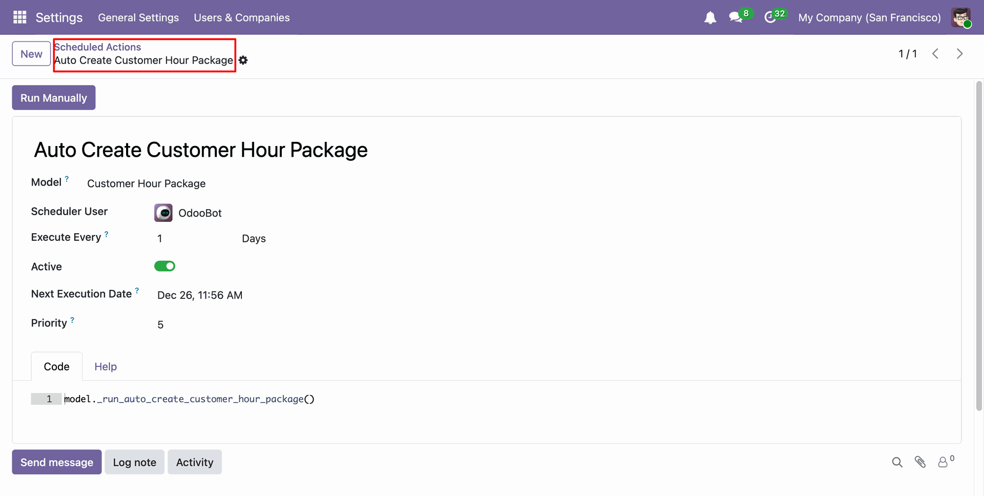 Go to the Scheduled Actions ==> Auto Create Customer Hours Package.