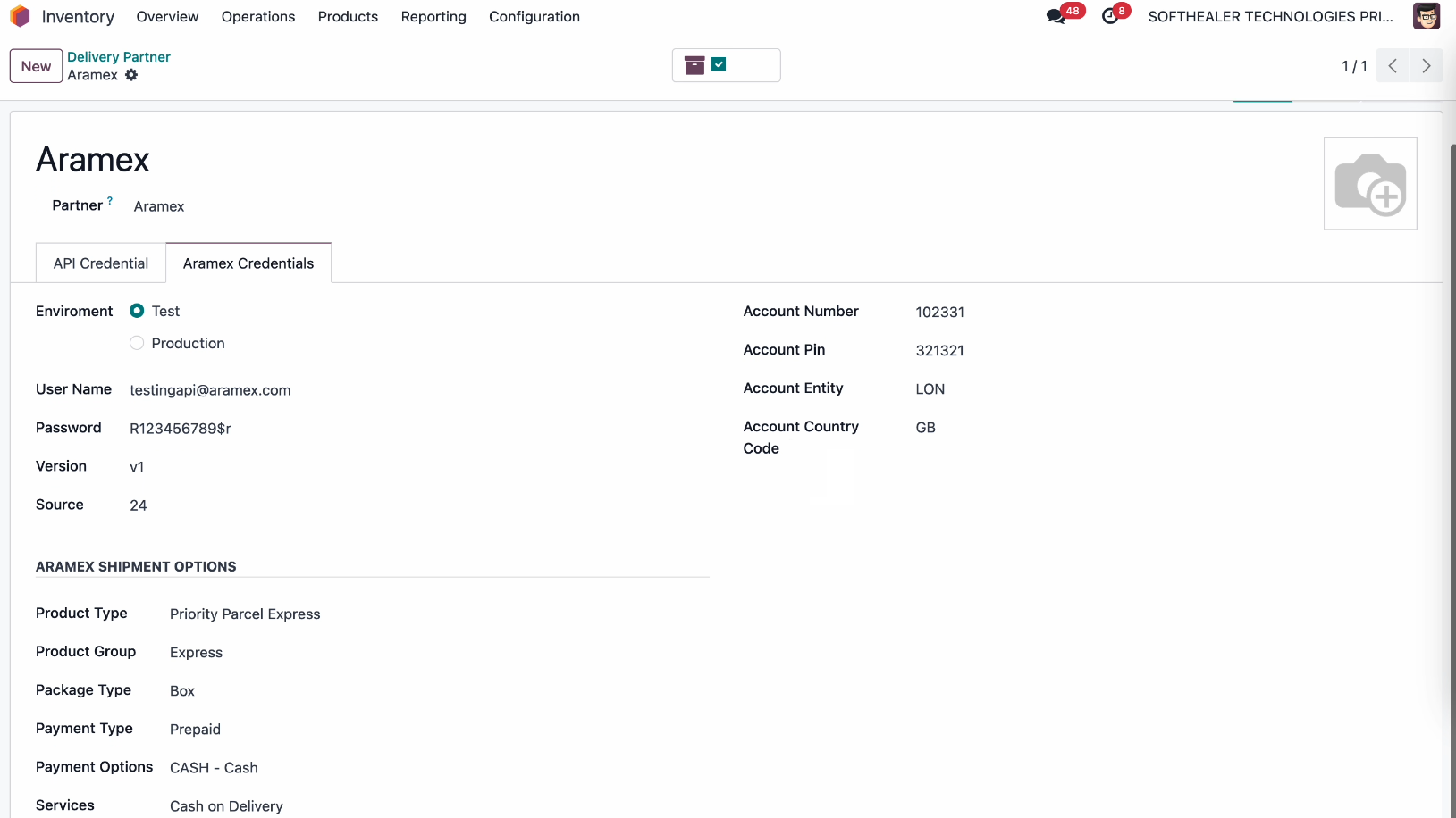 Set the environment to Test or Production and fill in your Aramex credentials for proper API authentication.