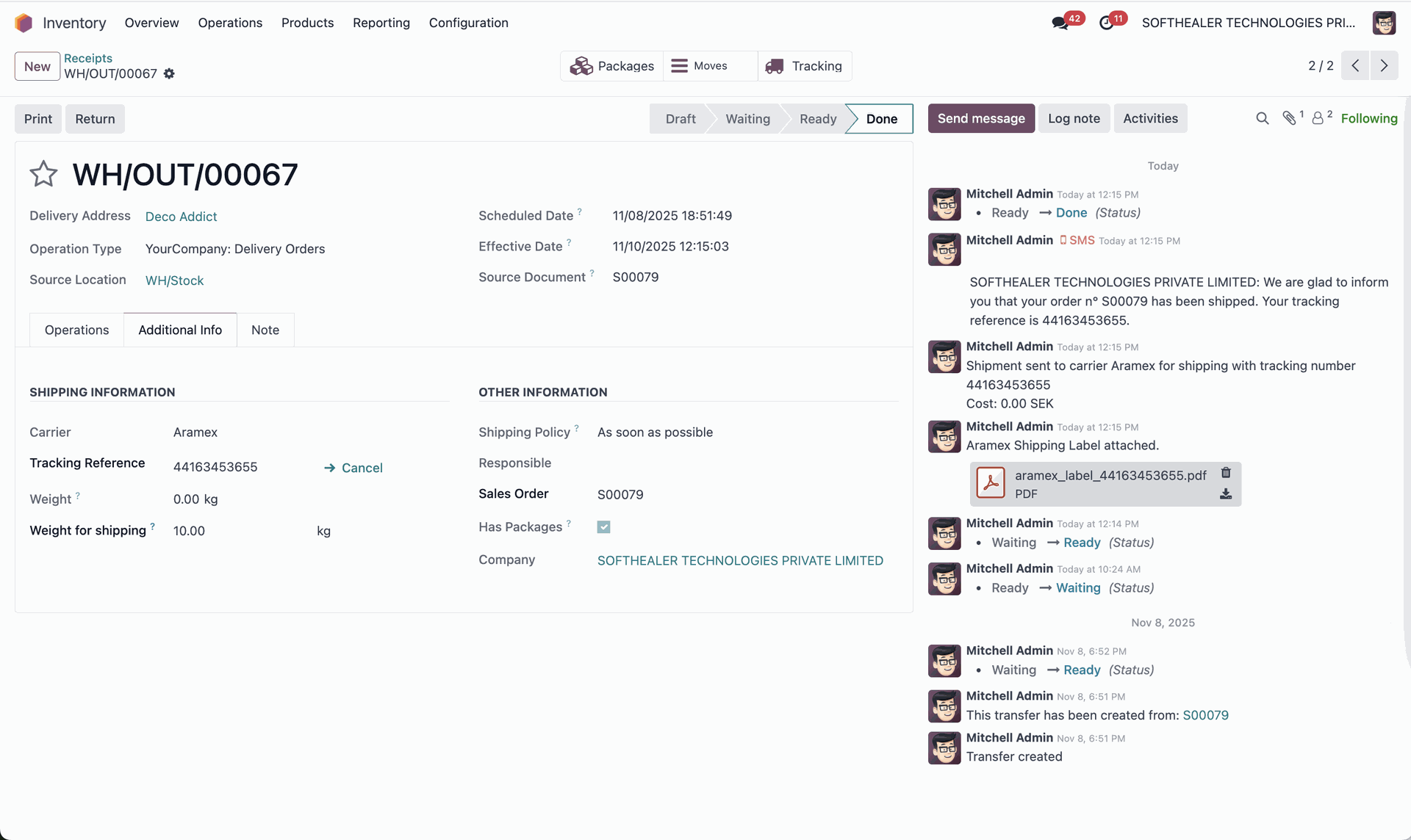 The delivery order with details. It displays the Shipping Information under the Additional Info tab after generating the label. In the log note, it shows that the shipping label was successfully generated, along with a downloadable PDF link.