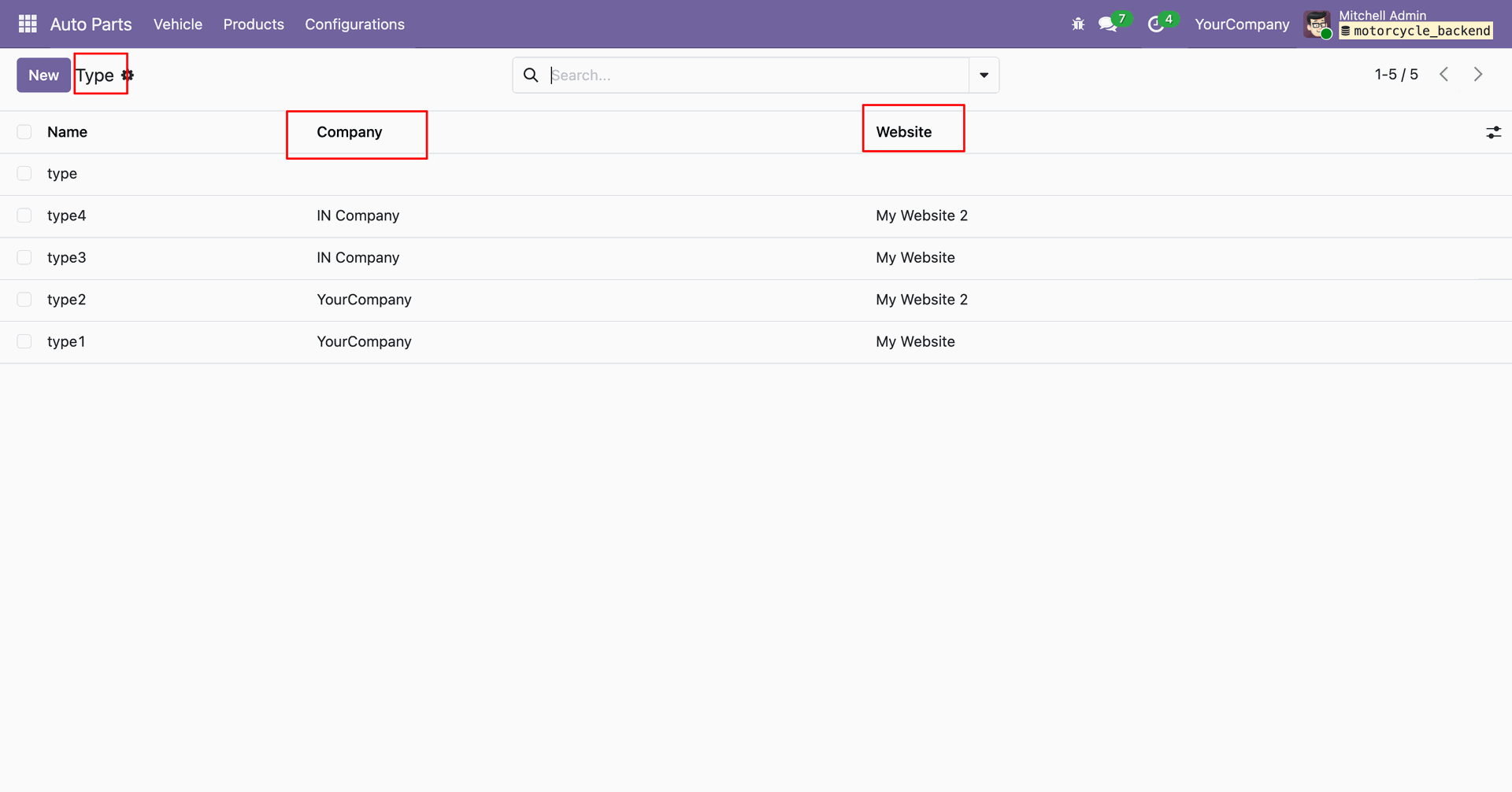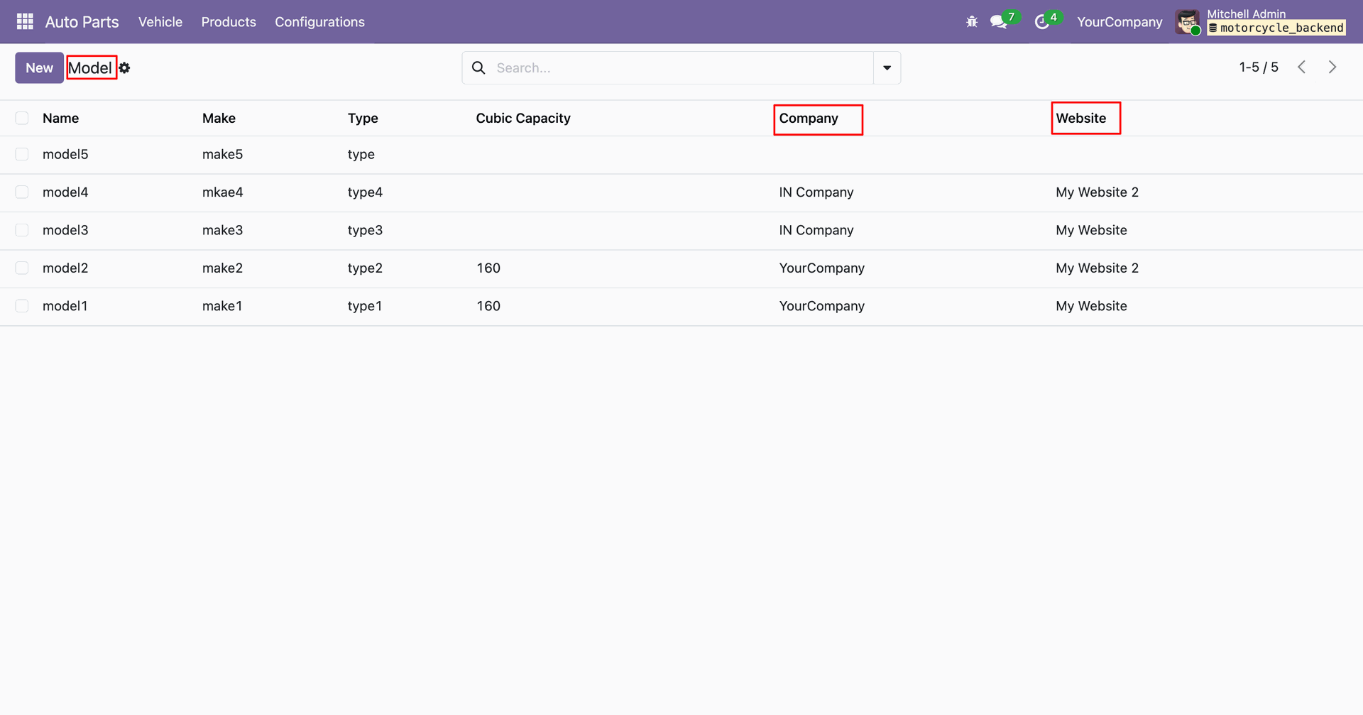 In the Auto Part model form view, you can add the associated website and company.