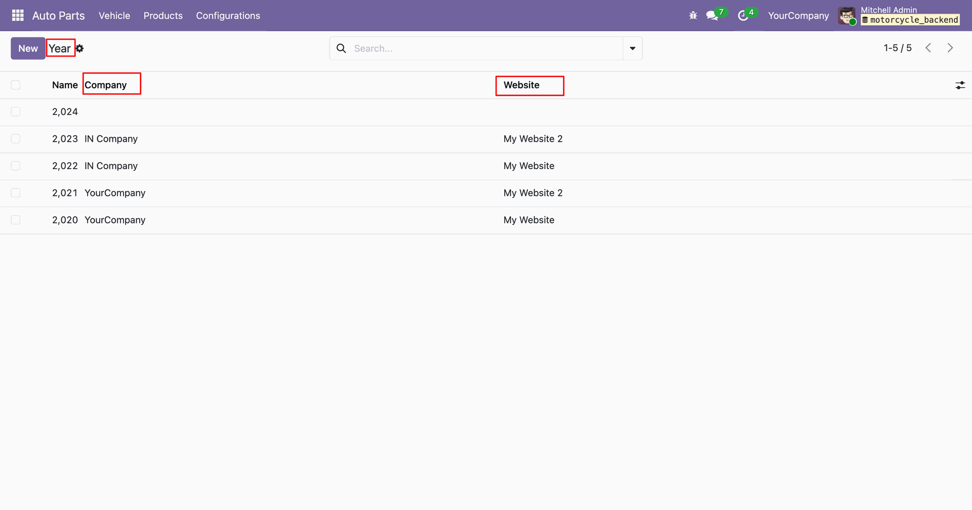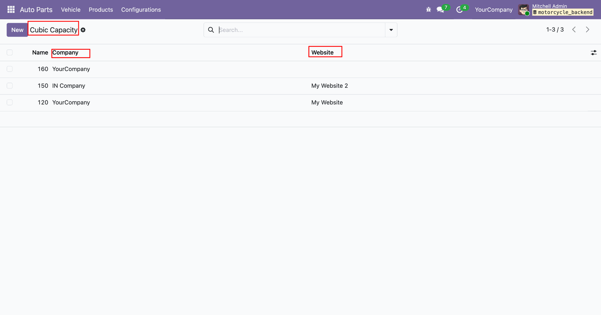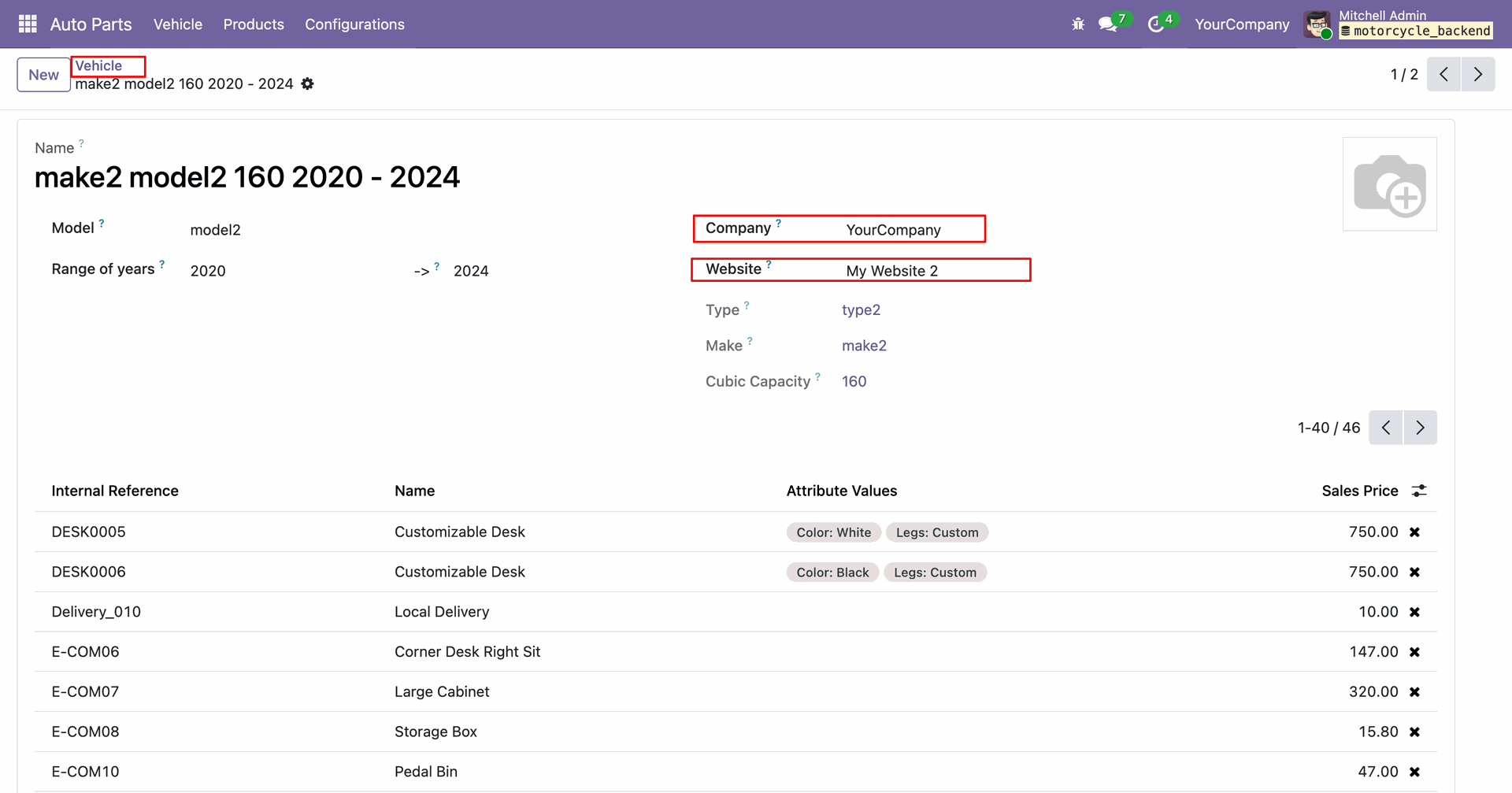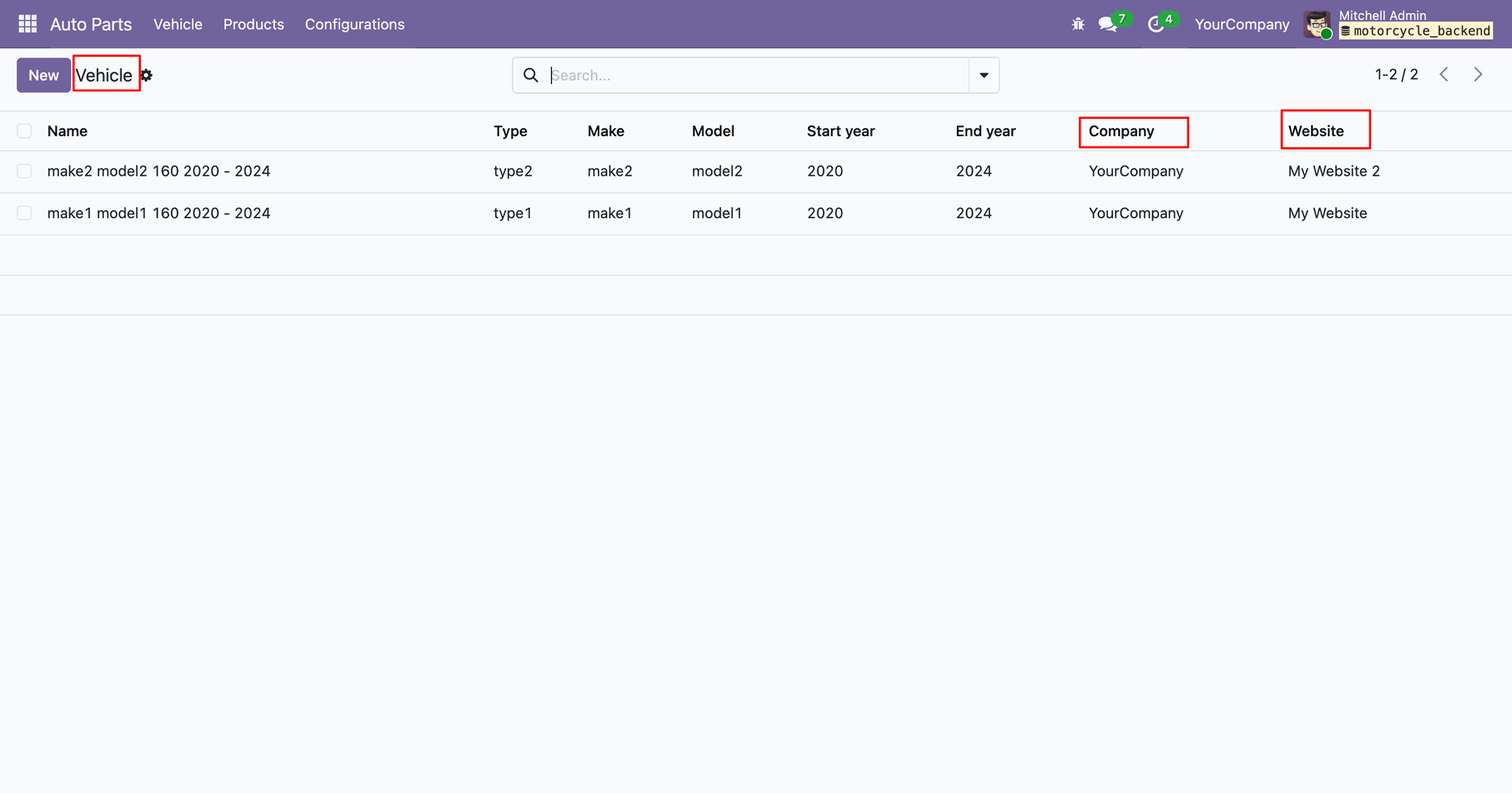 In the Auto Part Vehicle form view, you can add the associated website and company.