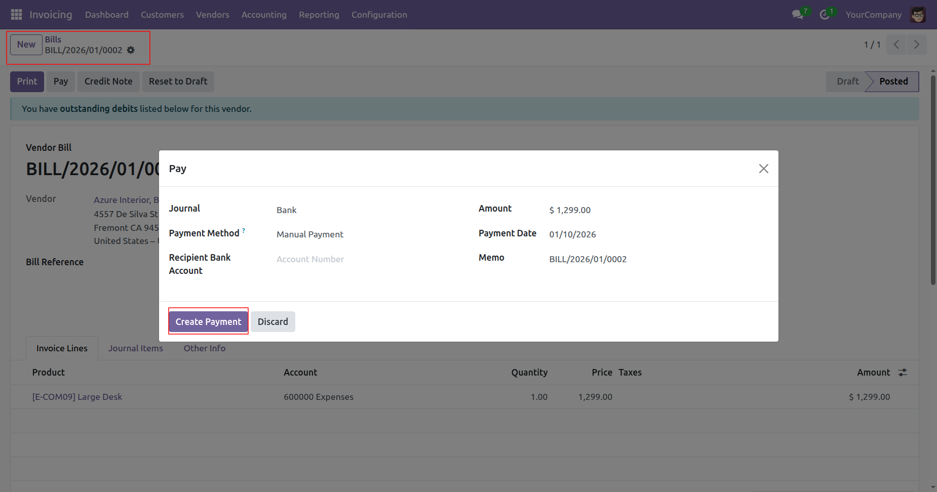 The user reviews the payment details for vendor bill BILL/2026/01/0002 and clicks the highlighted Create Payment button to complete the transaction process.