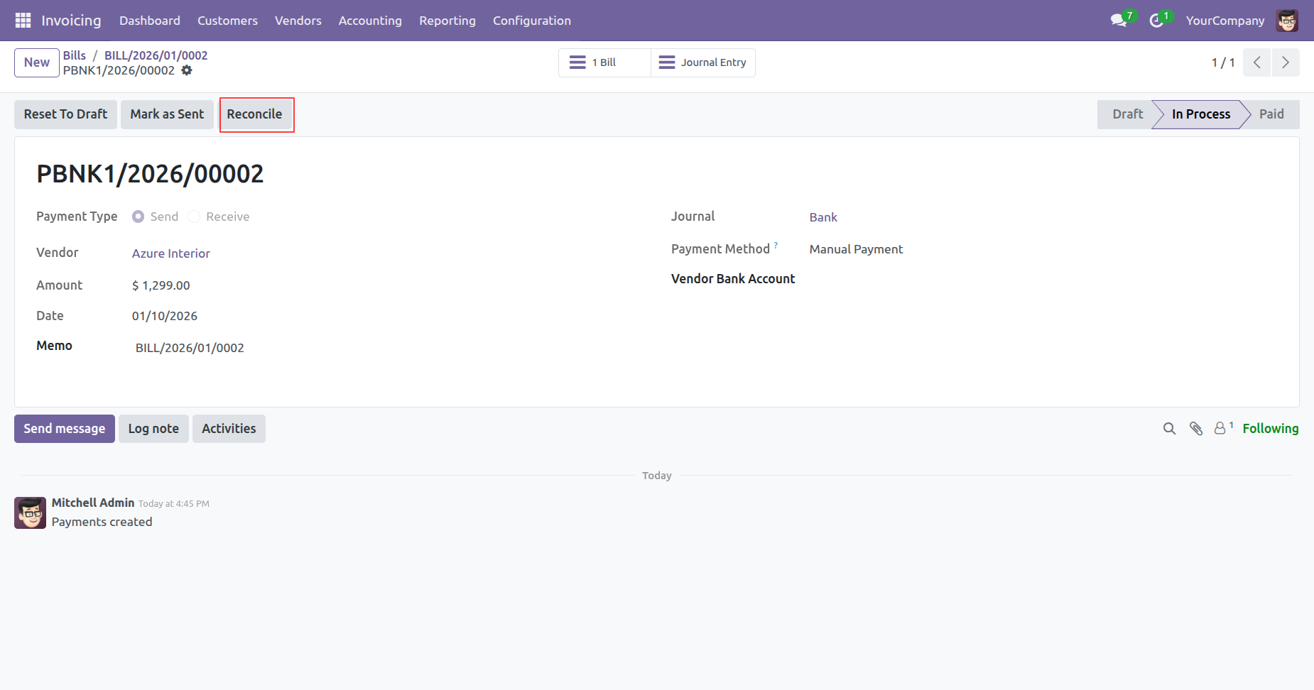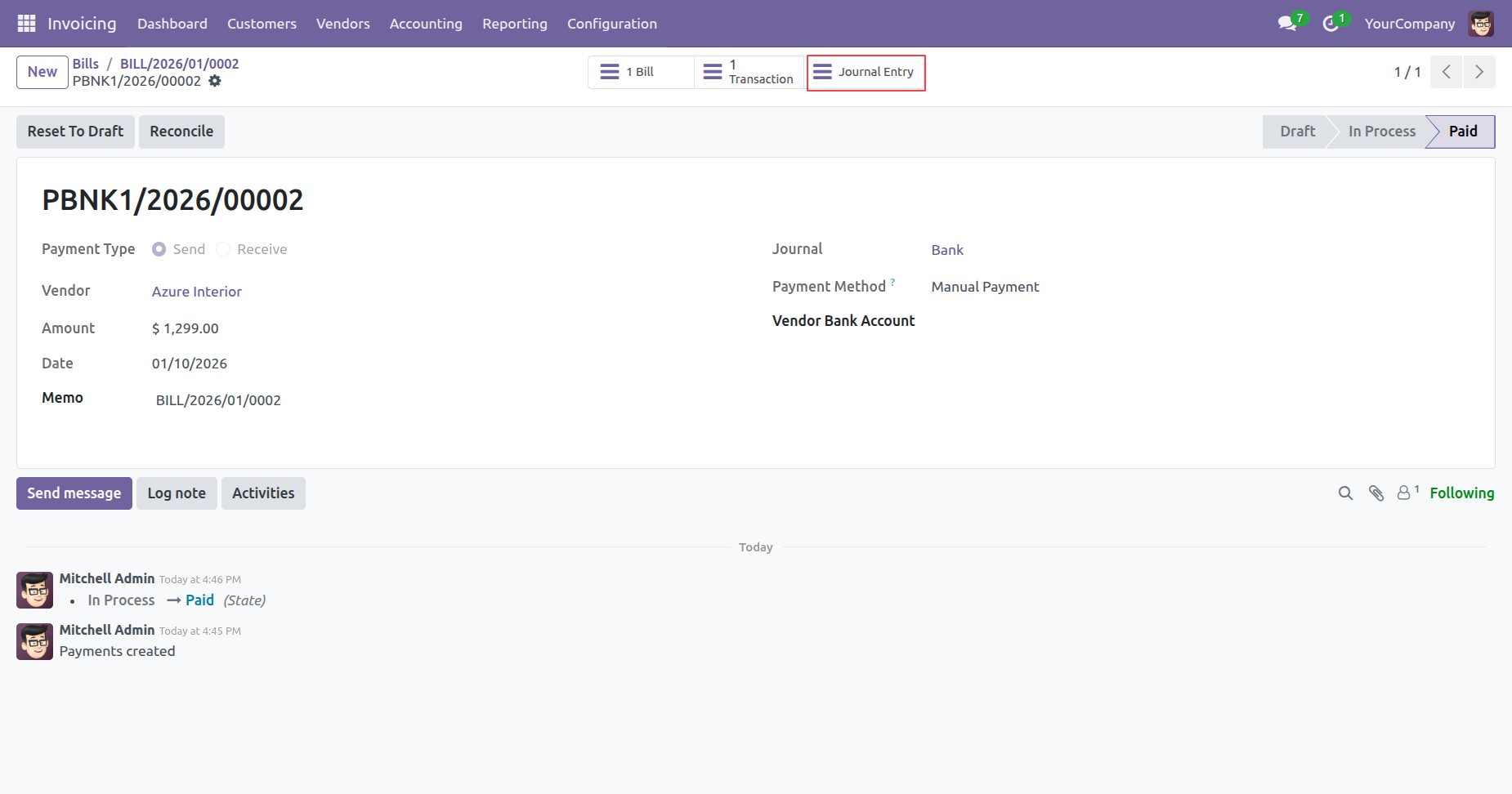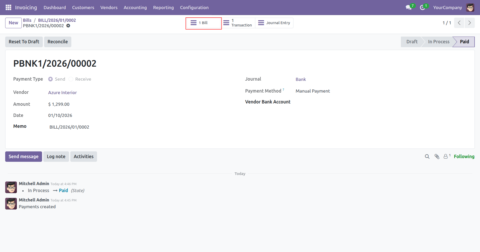 The highlighted 1 Bill smart button provides a direct link back to the original Vendor Bill, completing the cycle of traceability for the paid transaction.