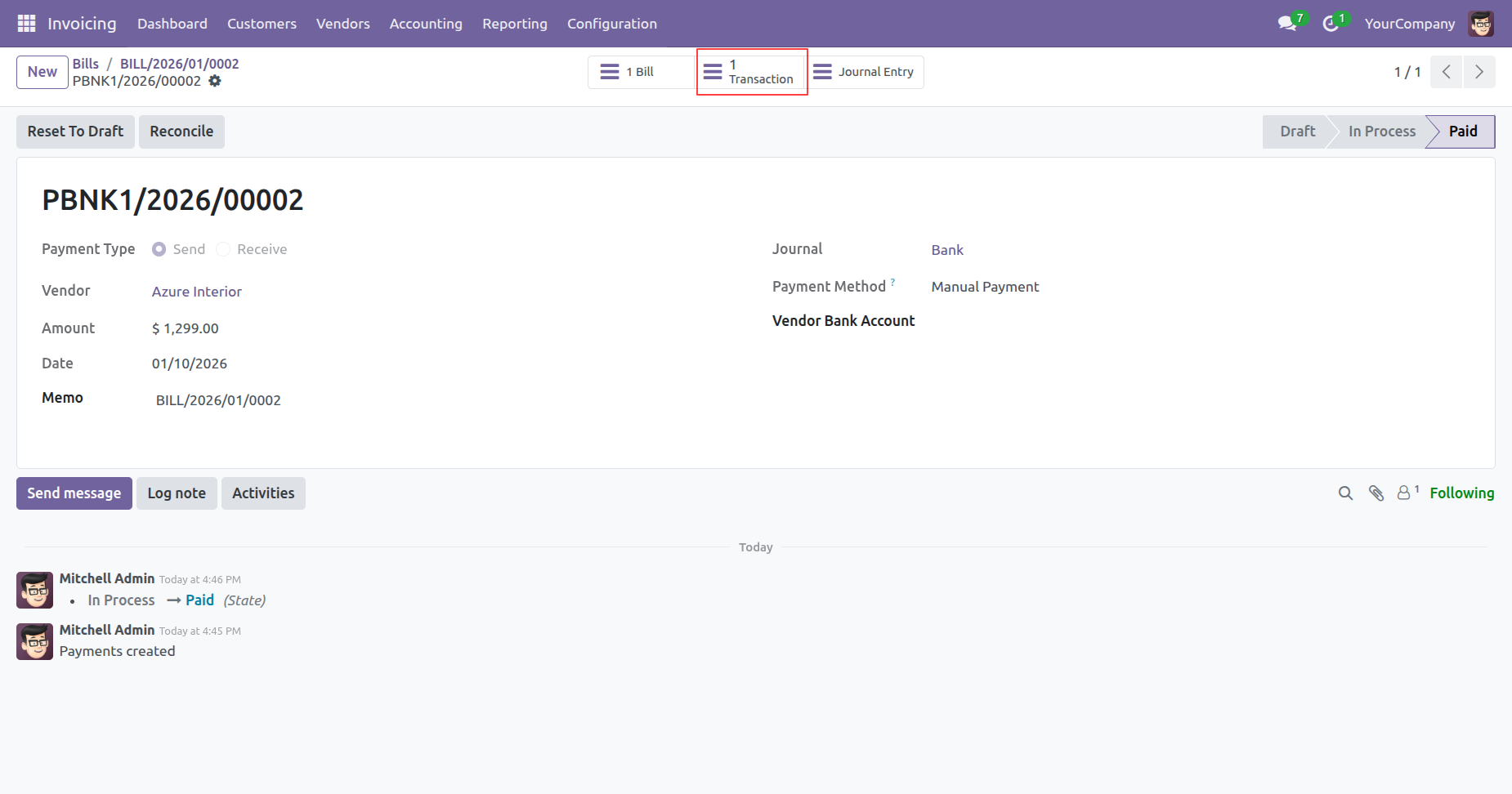 The payment status updates to Paid, and a highlighted 1 Transaction smart button appears, linking the payment to its newly created bank statement line.