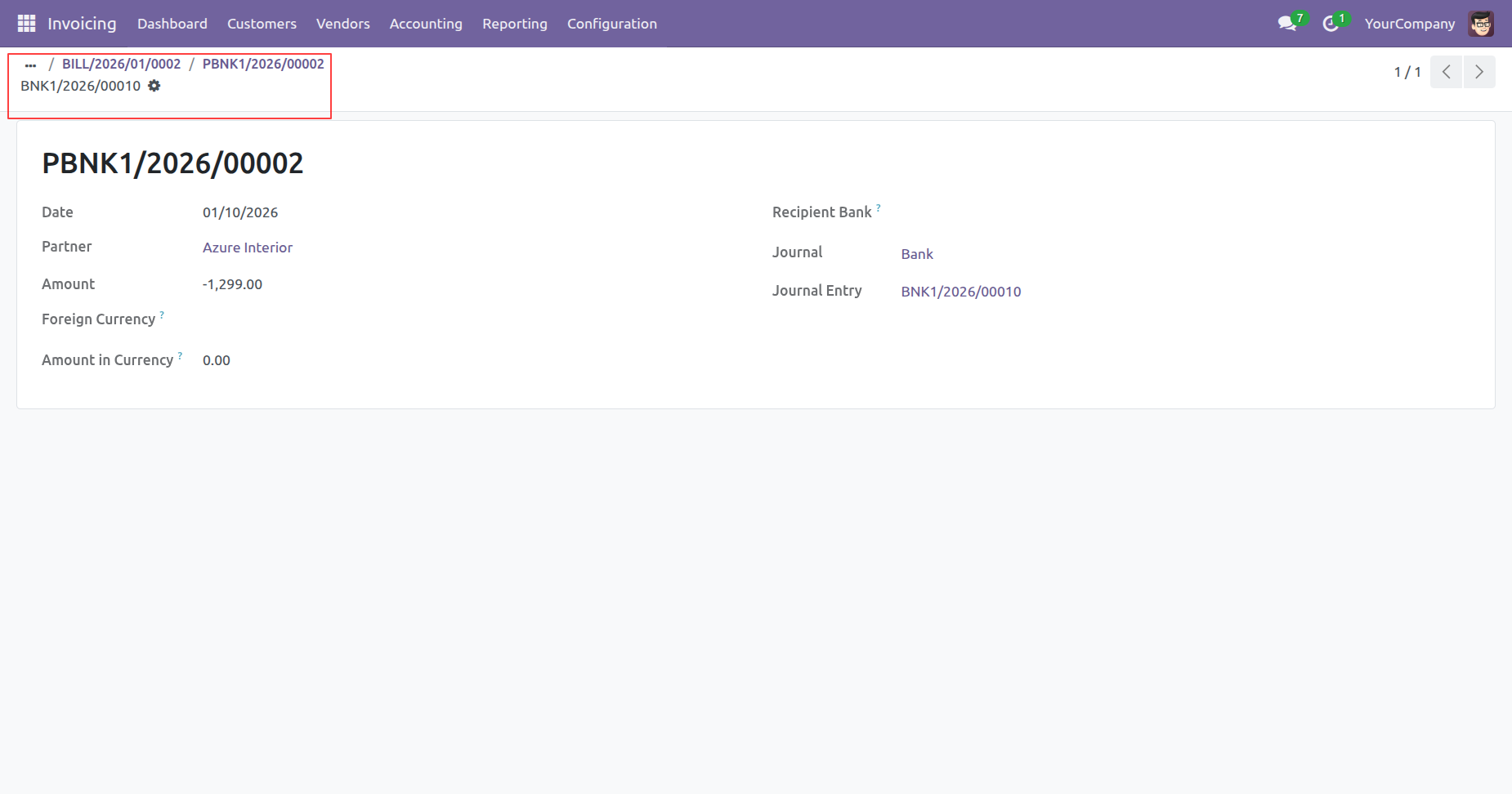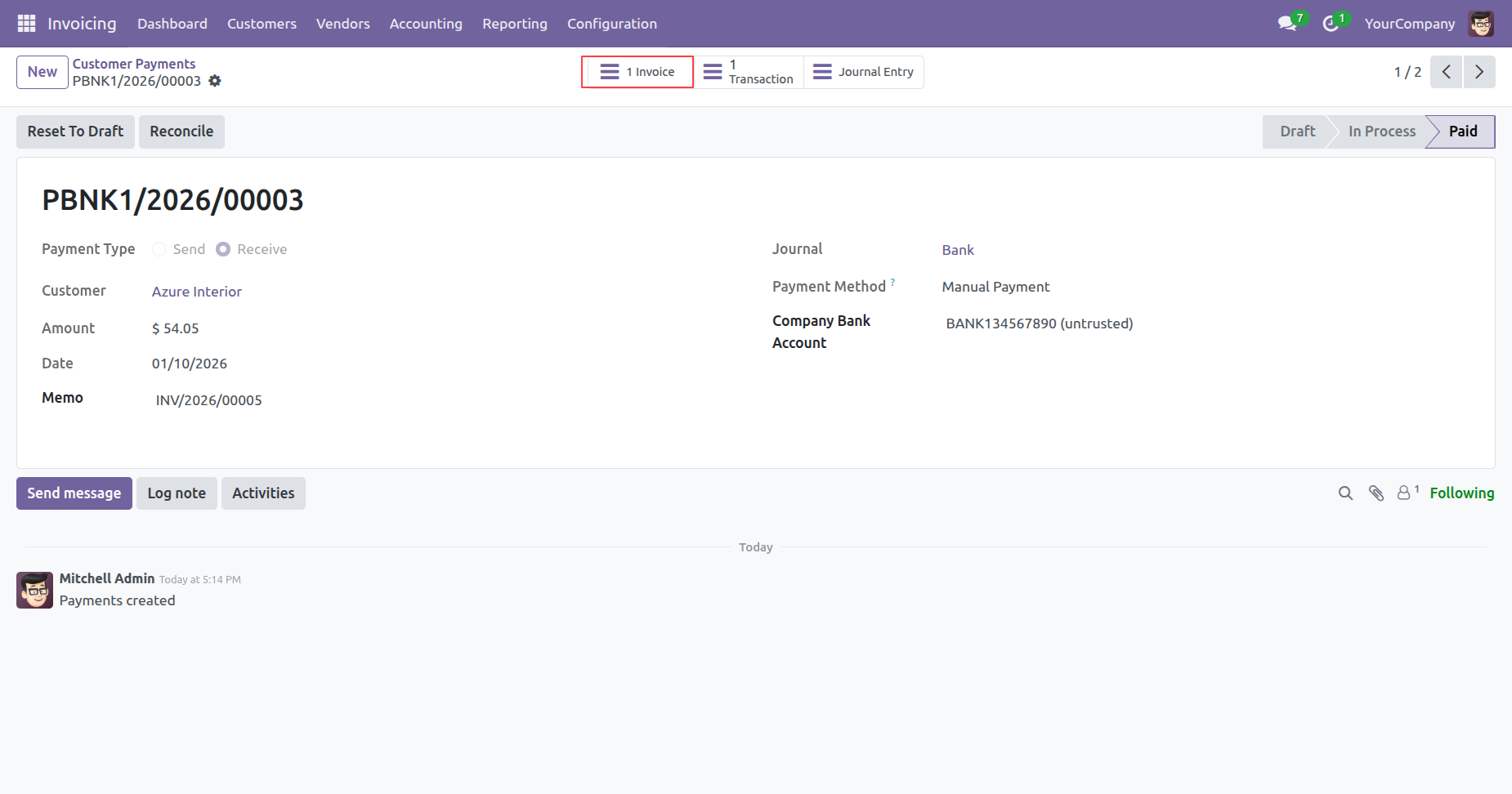 The highlighted 1 Invoice smart button allows the user to navigate directly back to the source invoice, ensuring full traceability of the paid transaction.