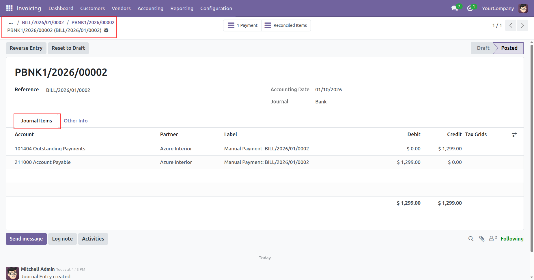 The Journal Items tab reveals the specific ledger entries, verifying the debit to Accounts Payable and the credit to Outstanding Payments linked to the original bill.