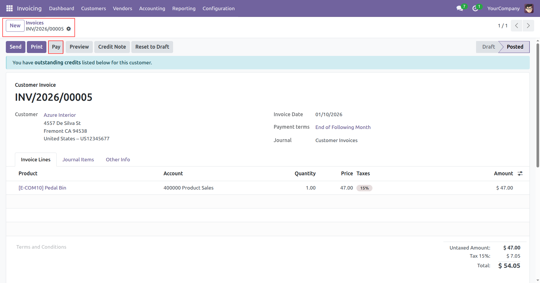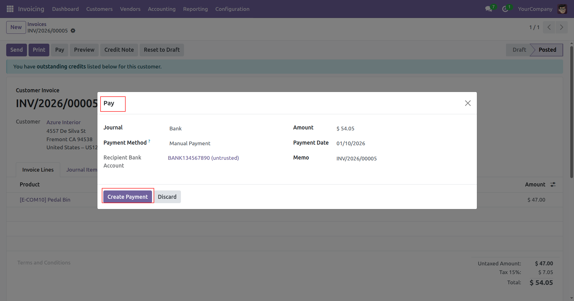 From the posted invoice view, the user clicks the highlighted Pay button to register the payment for the $54.05 due amount.
