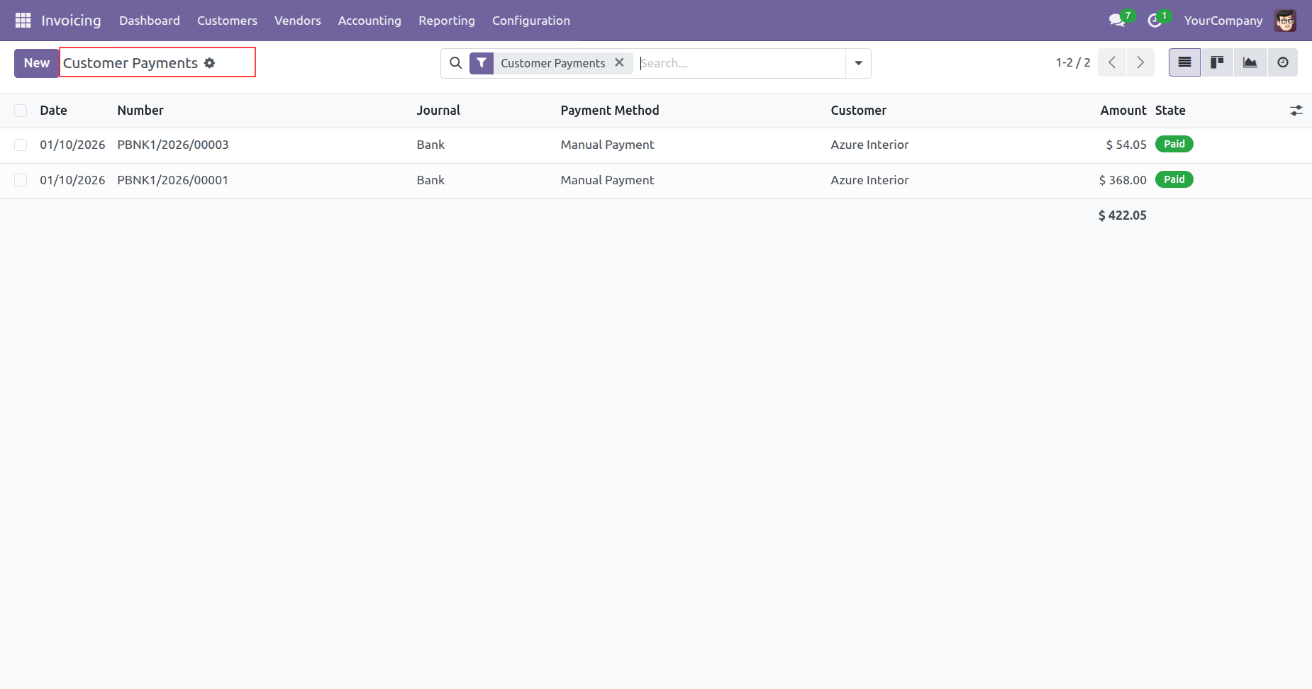 The Customer Payments list view confirms the successful registration of the $54.05 payment, showing it as a Paid record within the system's transaction history.