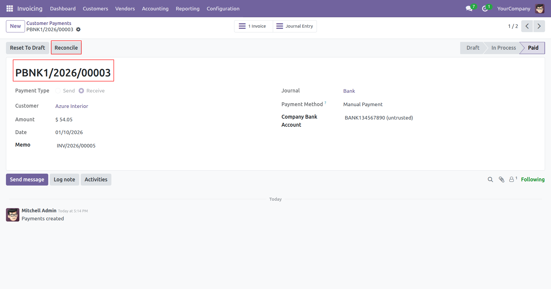 From the payment record view for PBNK1/2026/00003, the user clicks the highlighted Reconcile button to initiate the bank matching process for the $54.05 transaction.