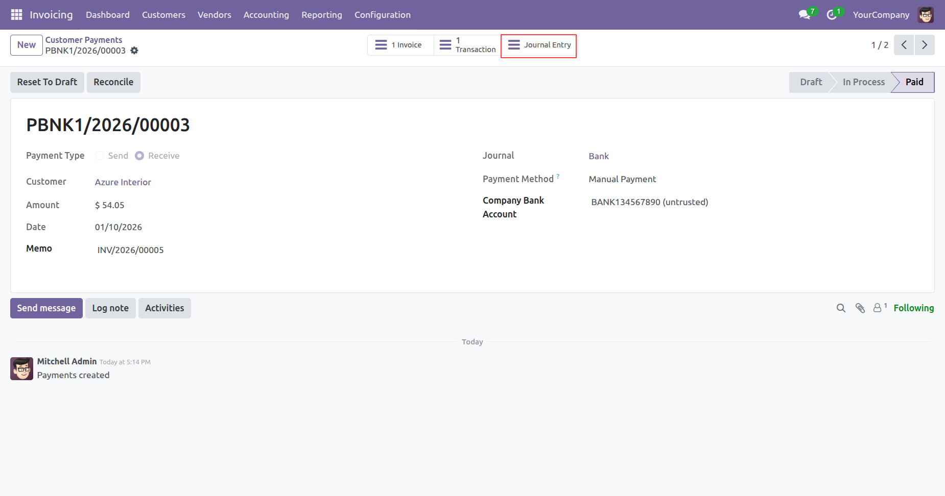The highlighted Journal Entry smart button grants access to the underlying accounting records generated for the completed payment.