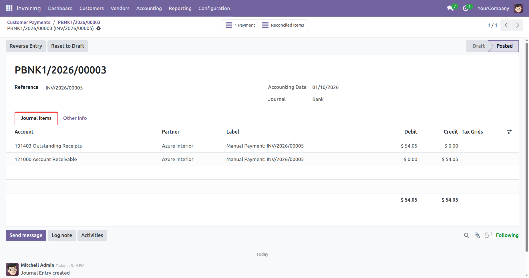 The Journal Items tab displays the specific ledger entries, verifying the debit to Outstanding Receipts and the credit to Accounts Receivable for the $54.05 payment.