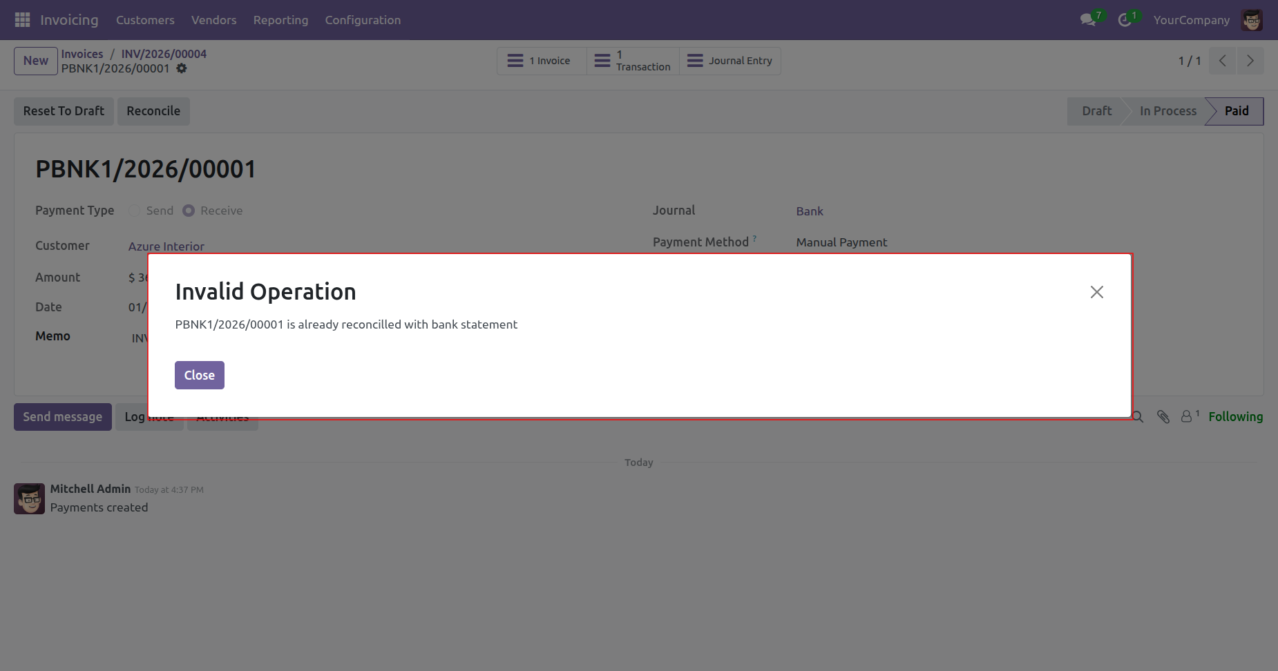The system displays an Invalid Operation warning to prevent the user from reconciling a payment that is already successfully linked to a bank statement.