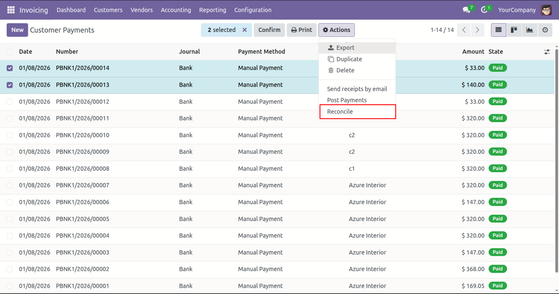The user selects multiple records in the Customer Payments view and chooses Reconcile from the Actions dropdown menu to process the selected transactions.