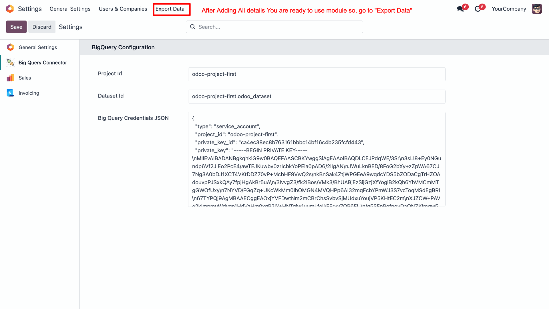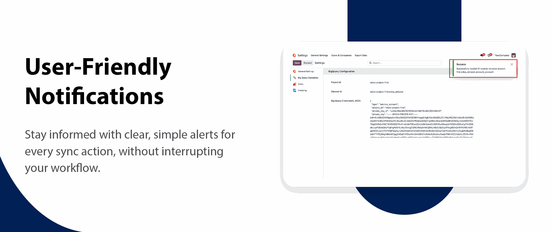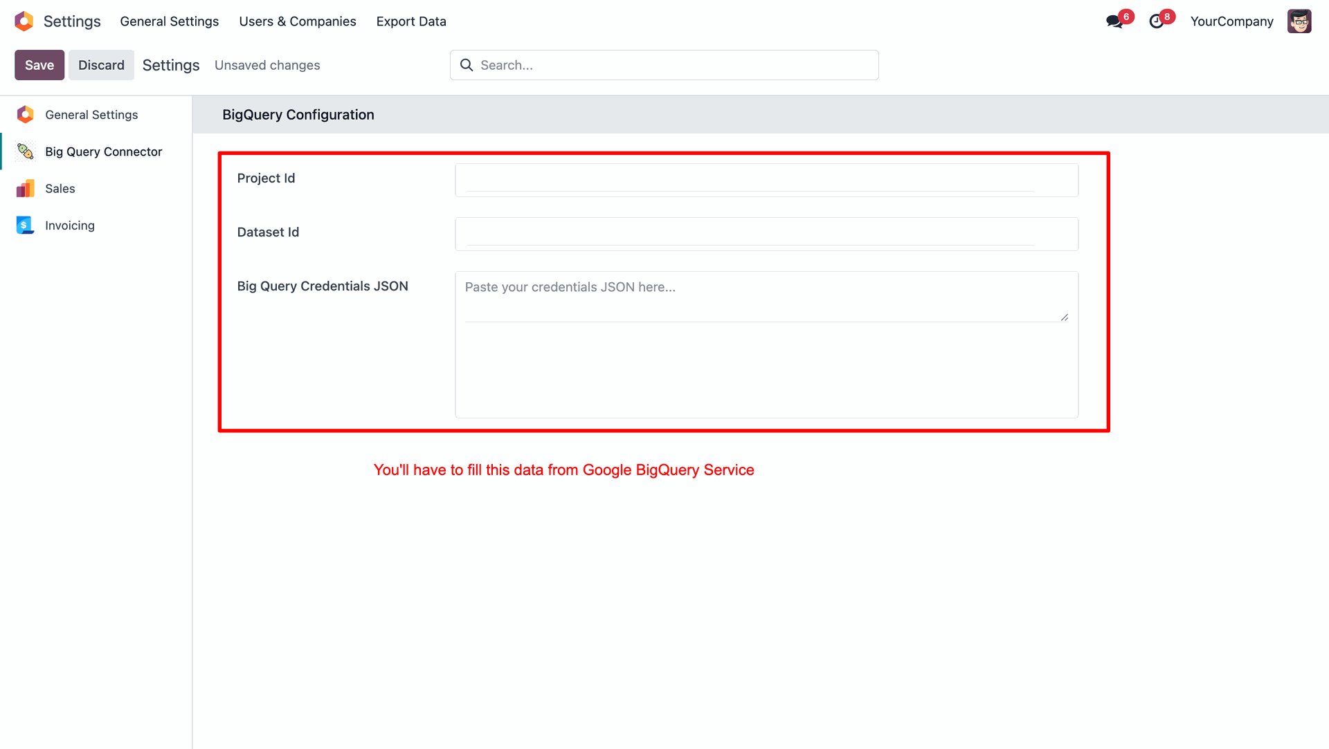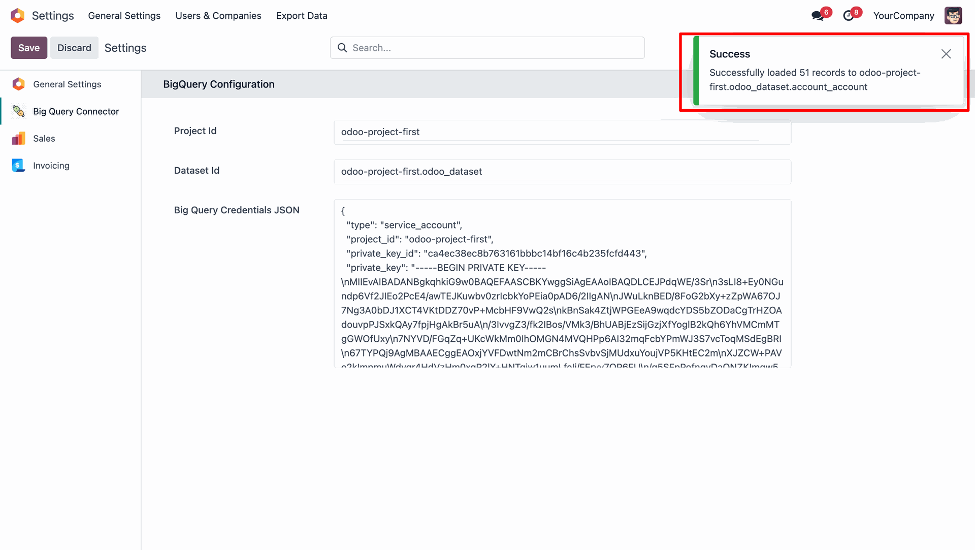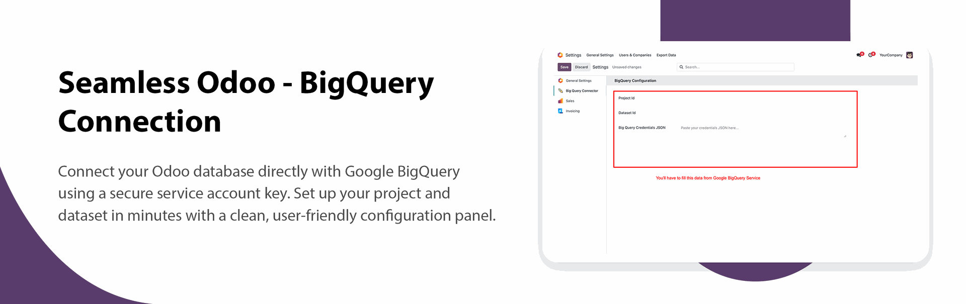 Easily configure your Google project, dataset and service account JSON key inside Odoo.