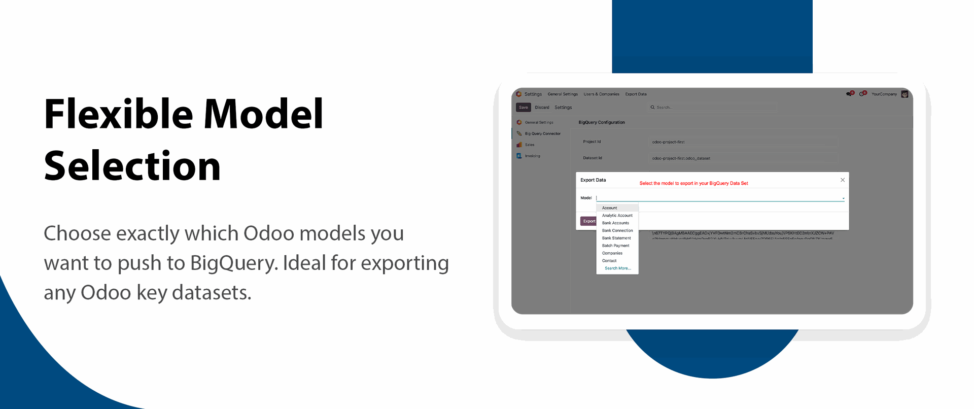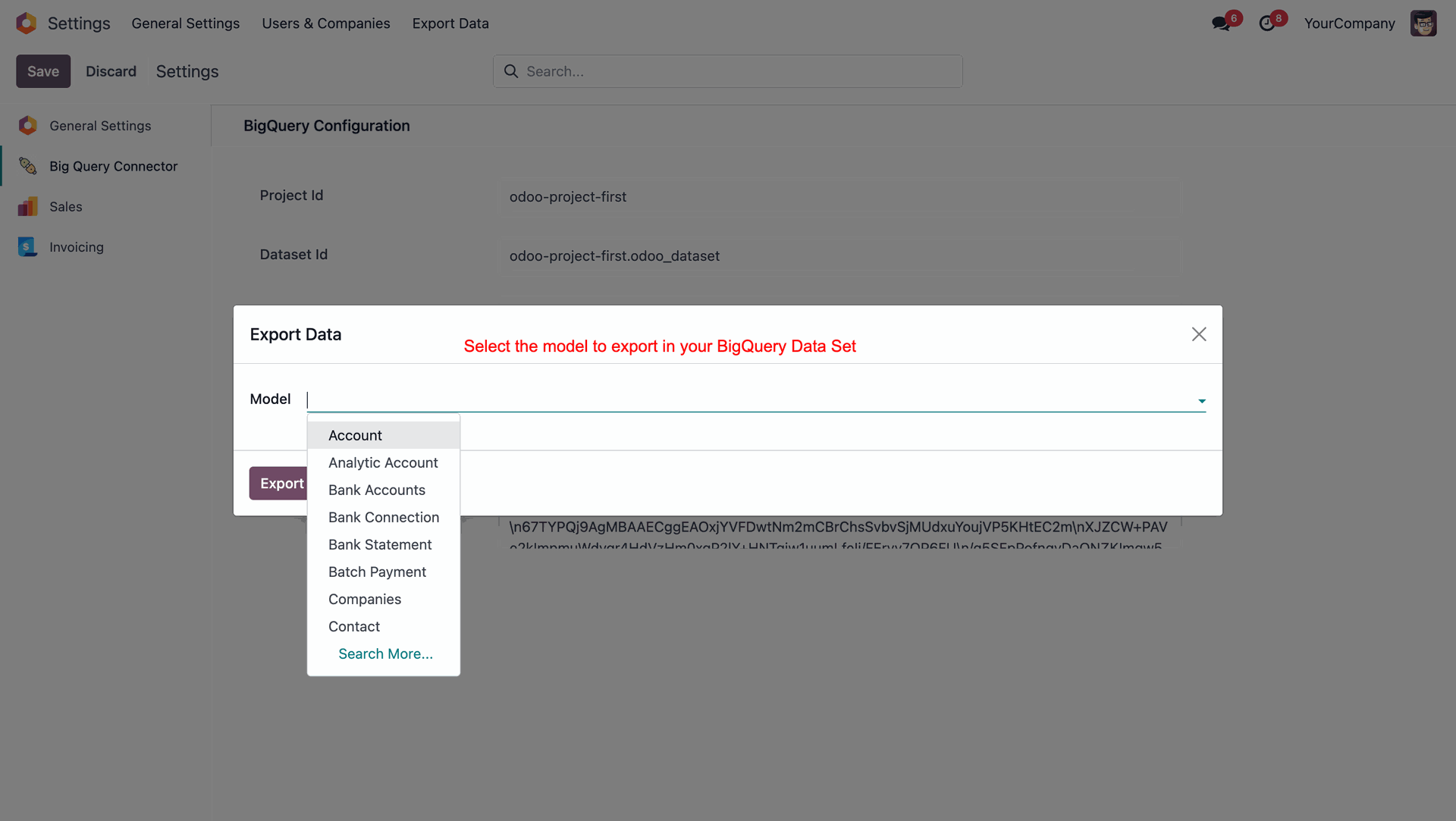 Choose which Odoo models (like Sales Orders, Products, Invoices, Customers etc.) you want to send to BigQuery.
