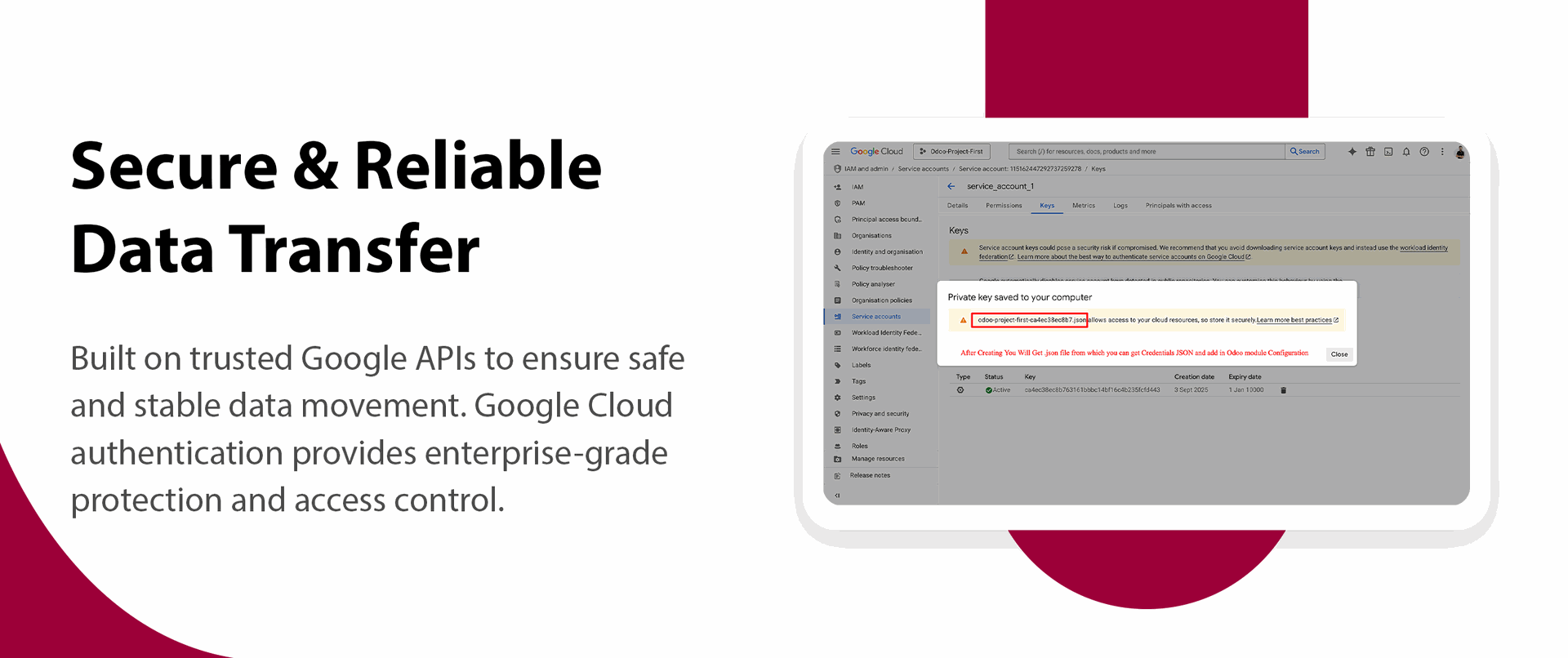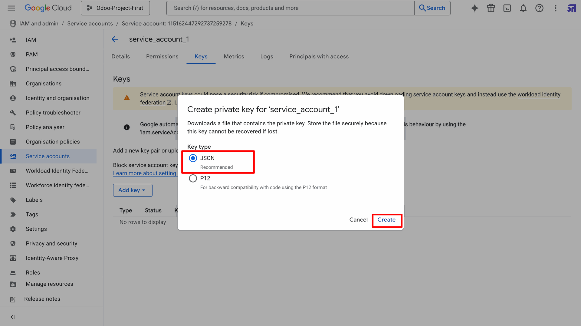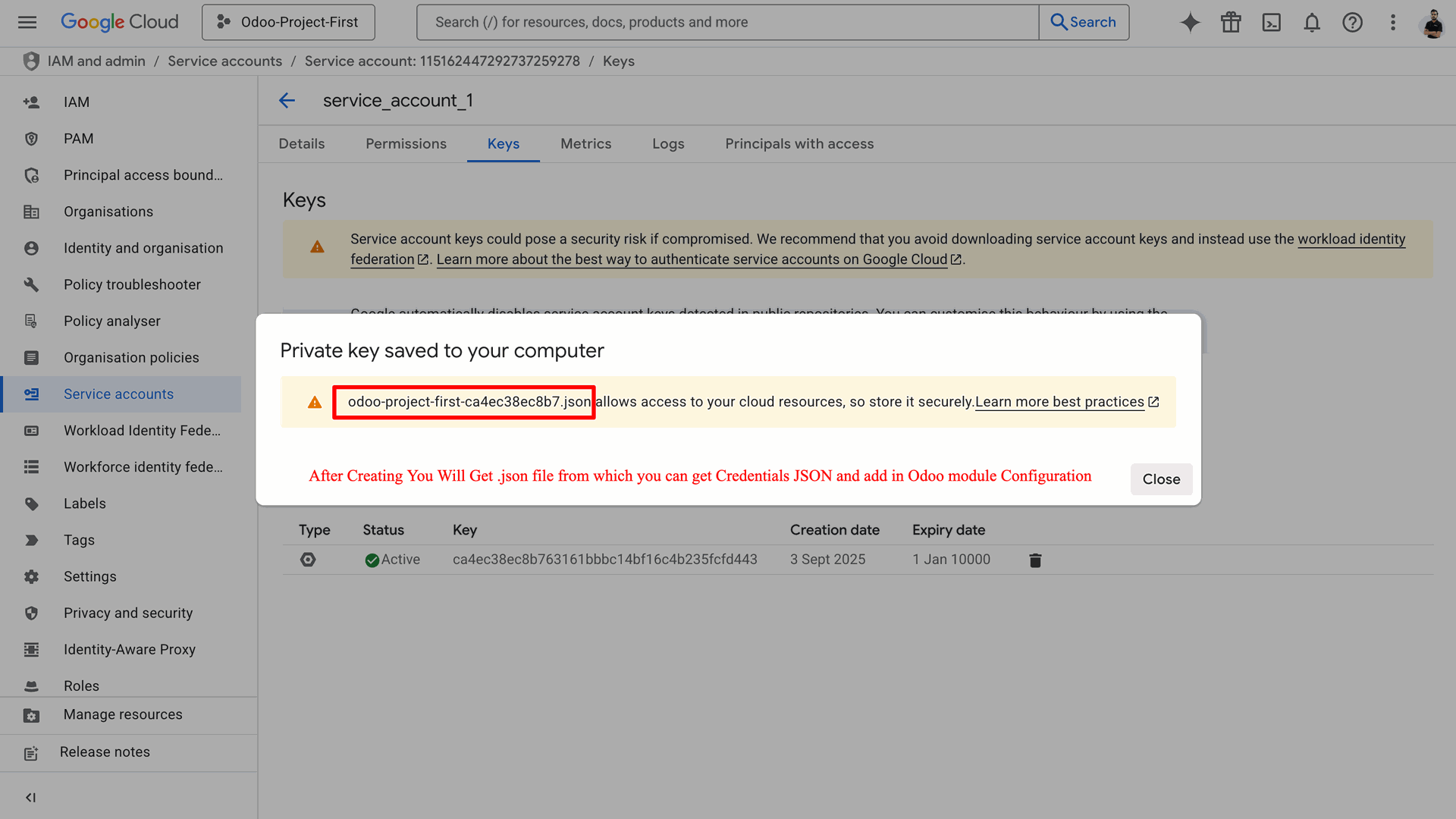 Here, you’ll find the JSON file. Copy the JSON credentials from the link and add them to the Odoo module's 'BigQuery Configuration'.