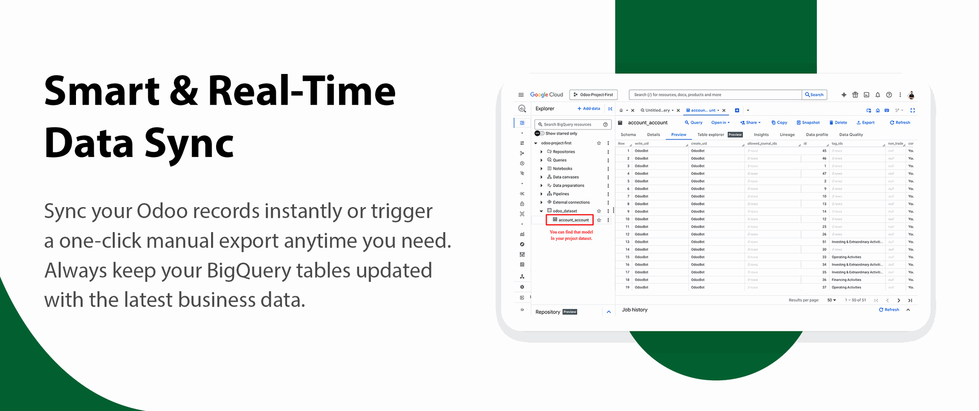 Send data from Odoo into BigQuery for reporting and analytics, map them into BigQuery table columns.