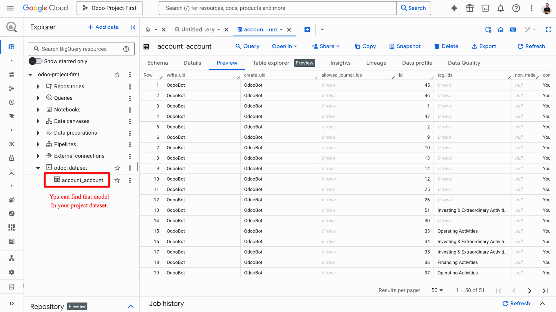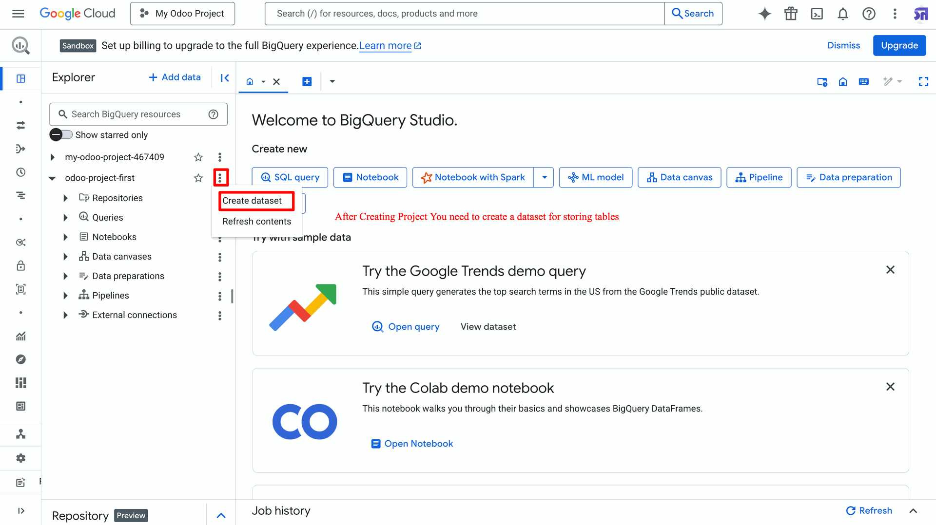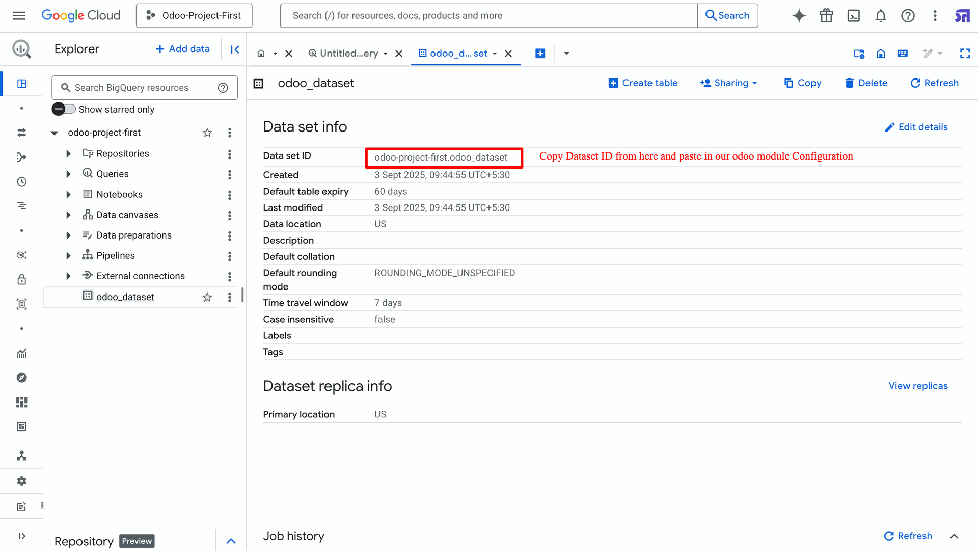 Here, you can see the created dataset ID. Copy it and paste it into the Odoo module's 'BigQuery Configuration'.