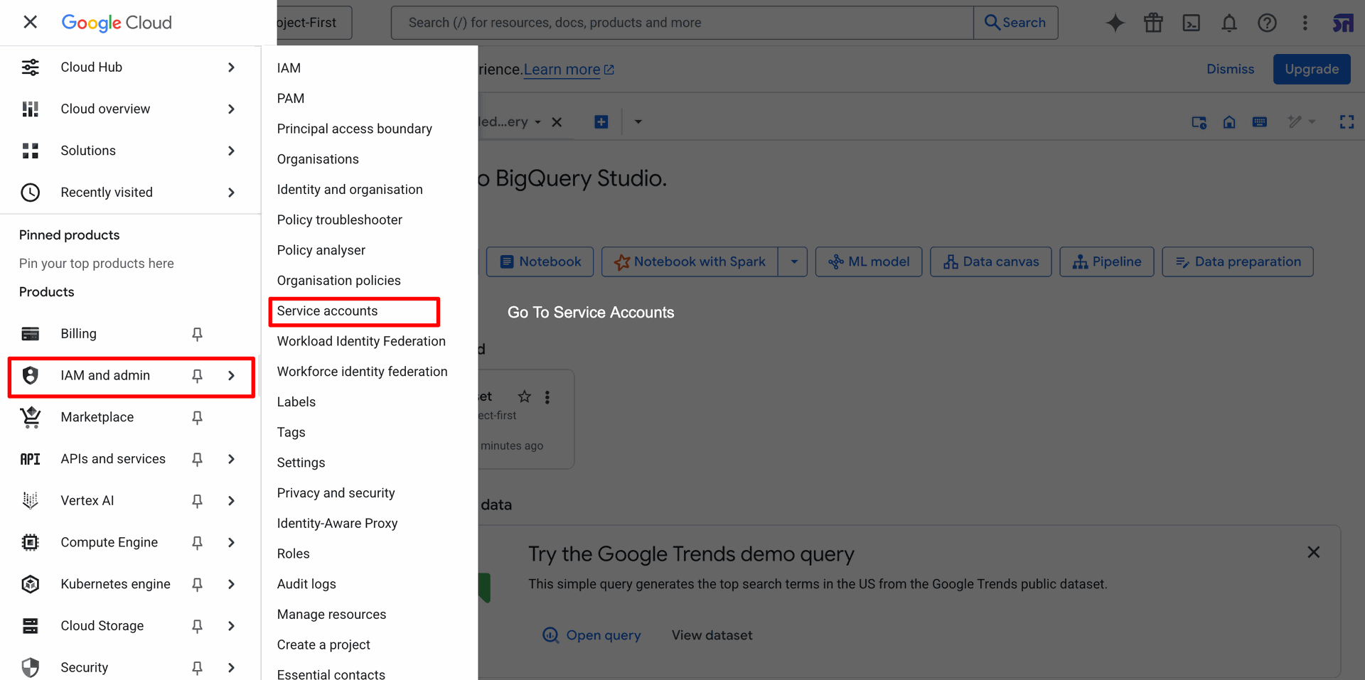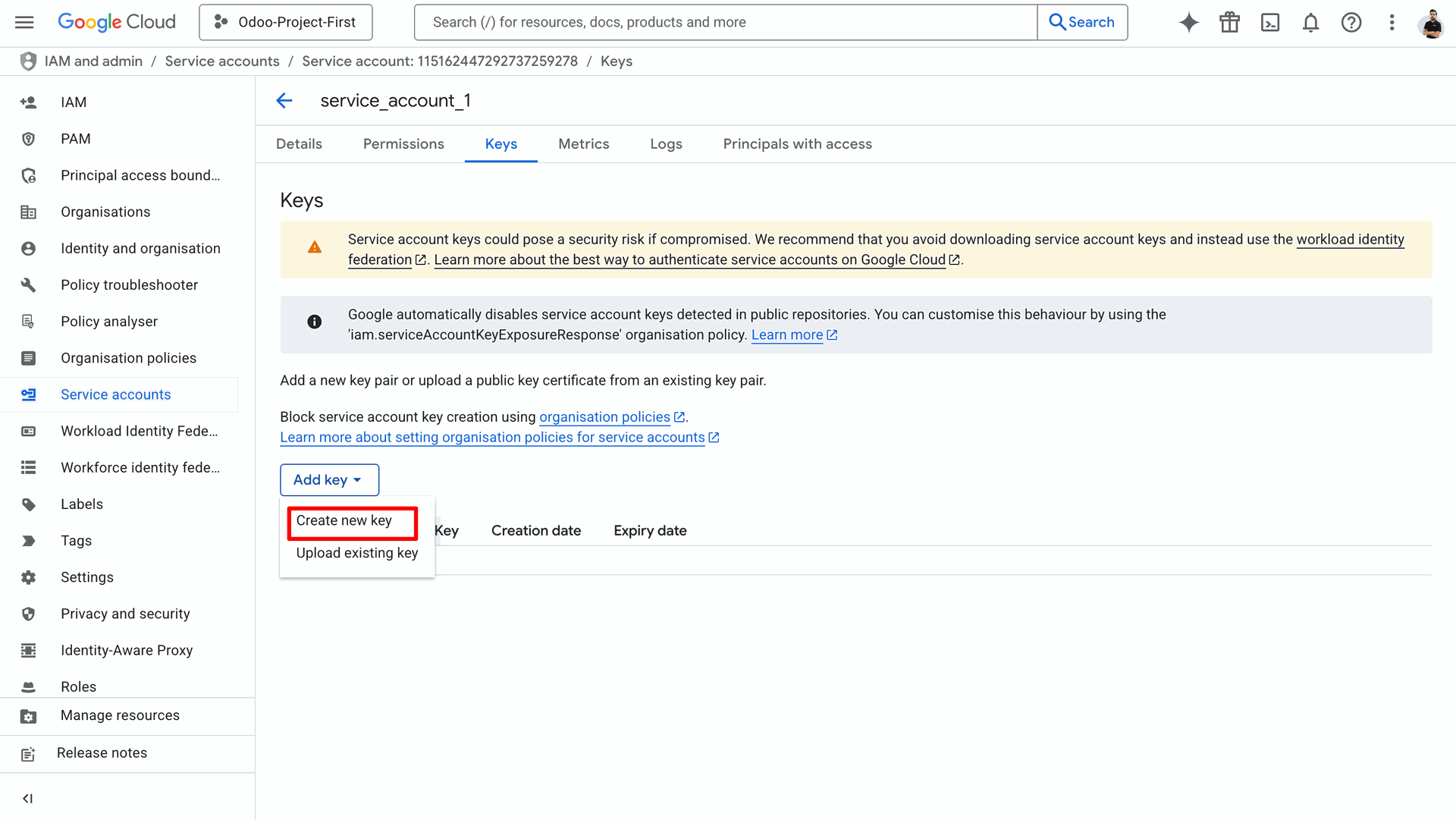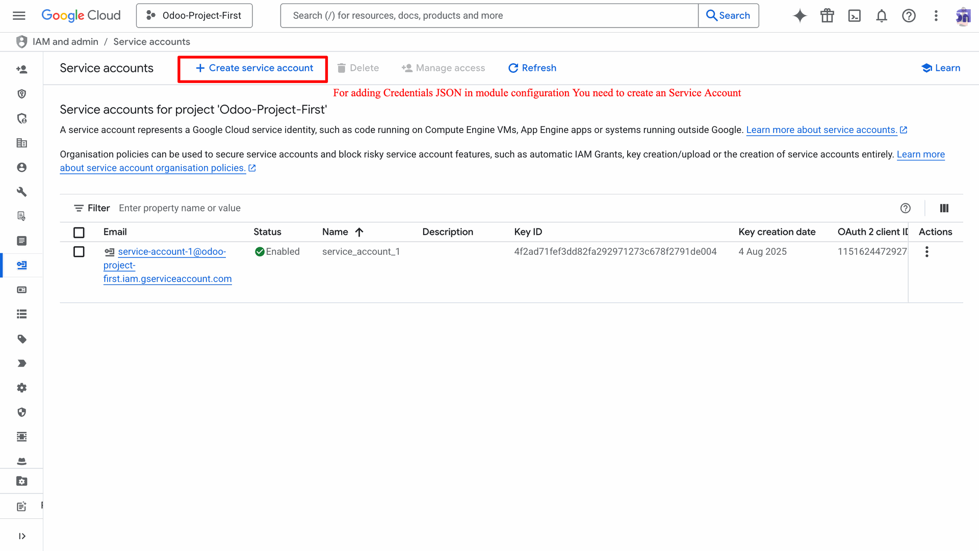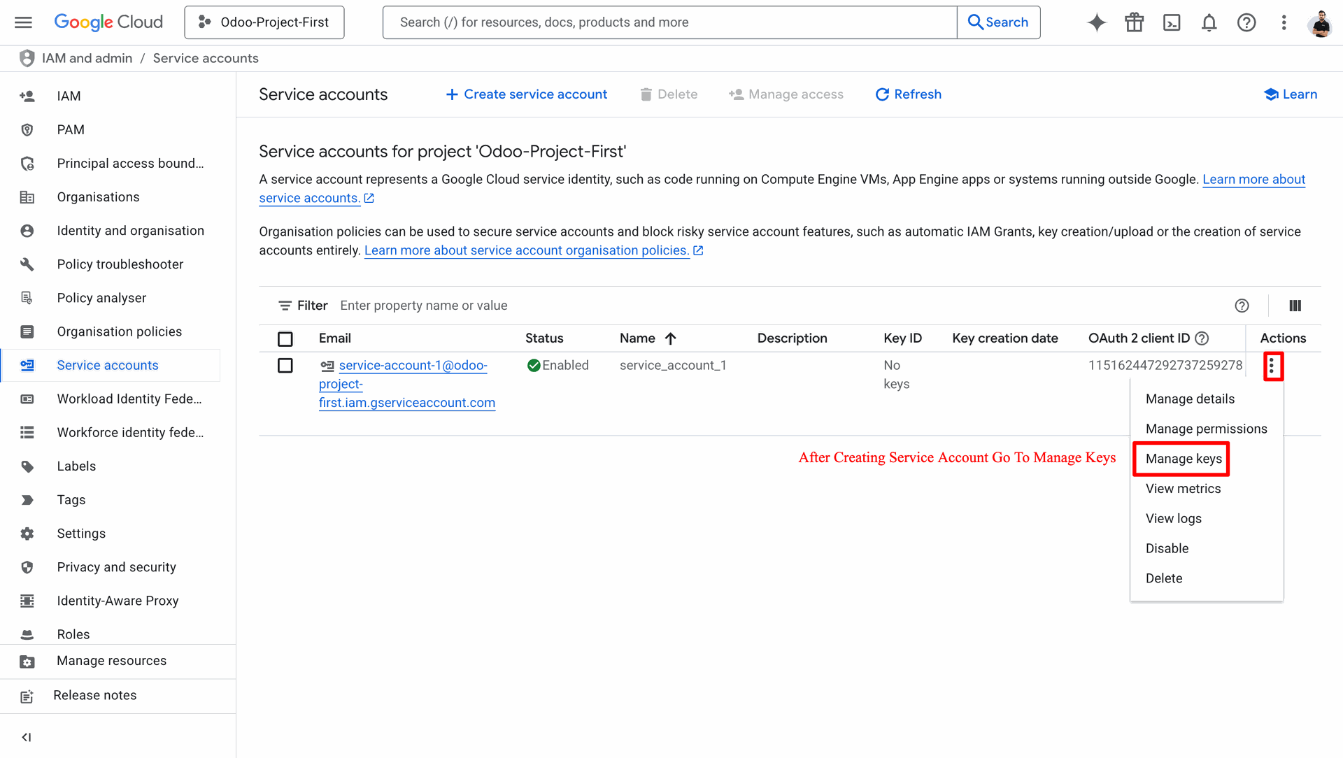 Go to the 'IAM and admin' ==> 'Service accounts'.