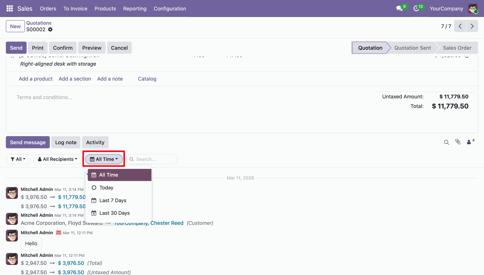 Users can filter chatter history by All time, Today, Last 7 Days, or Last 30 Days to quickly access past records.