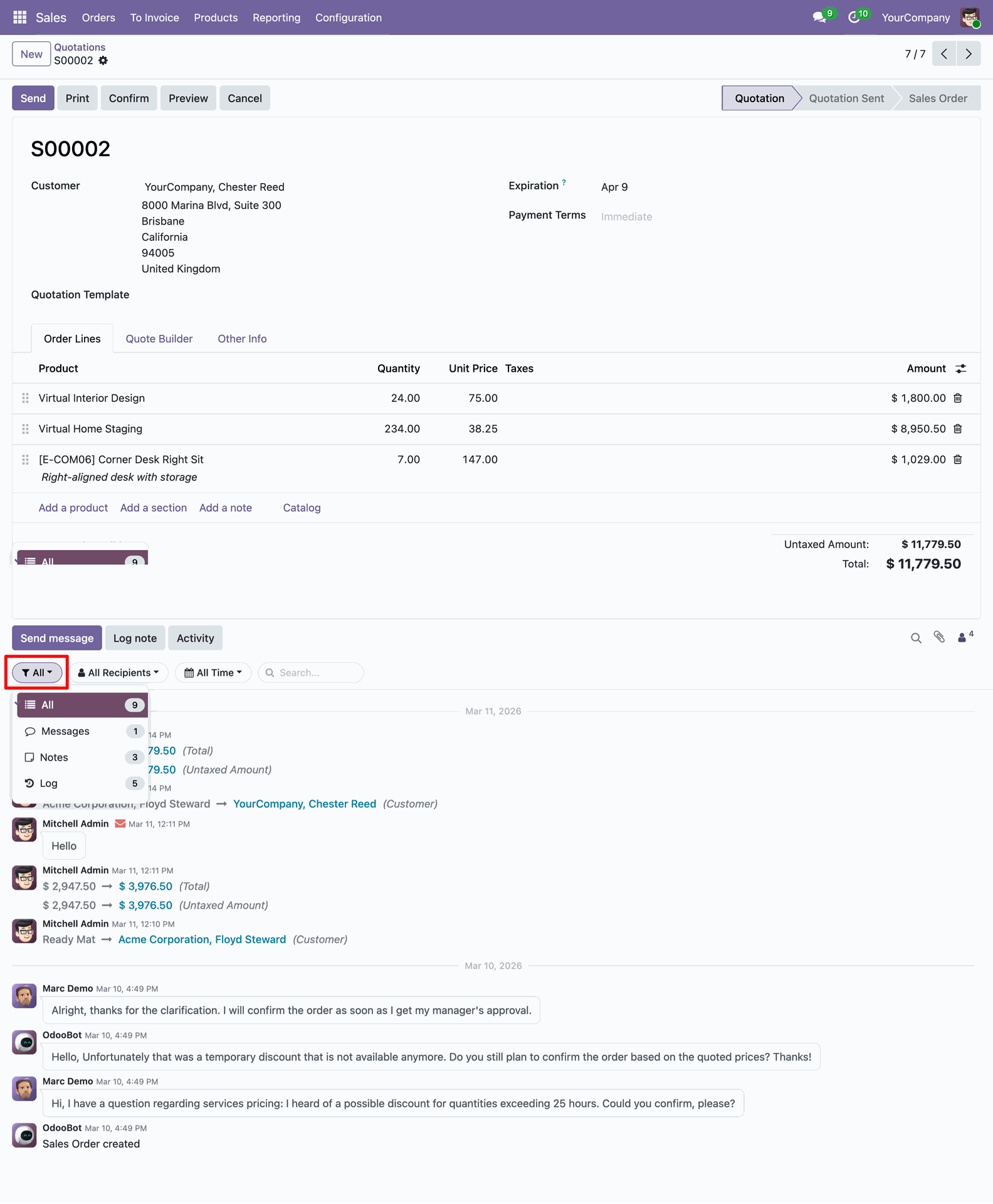Easily view messages, internal notes, or system logs using the chatter filters.