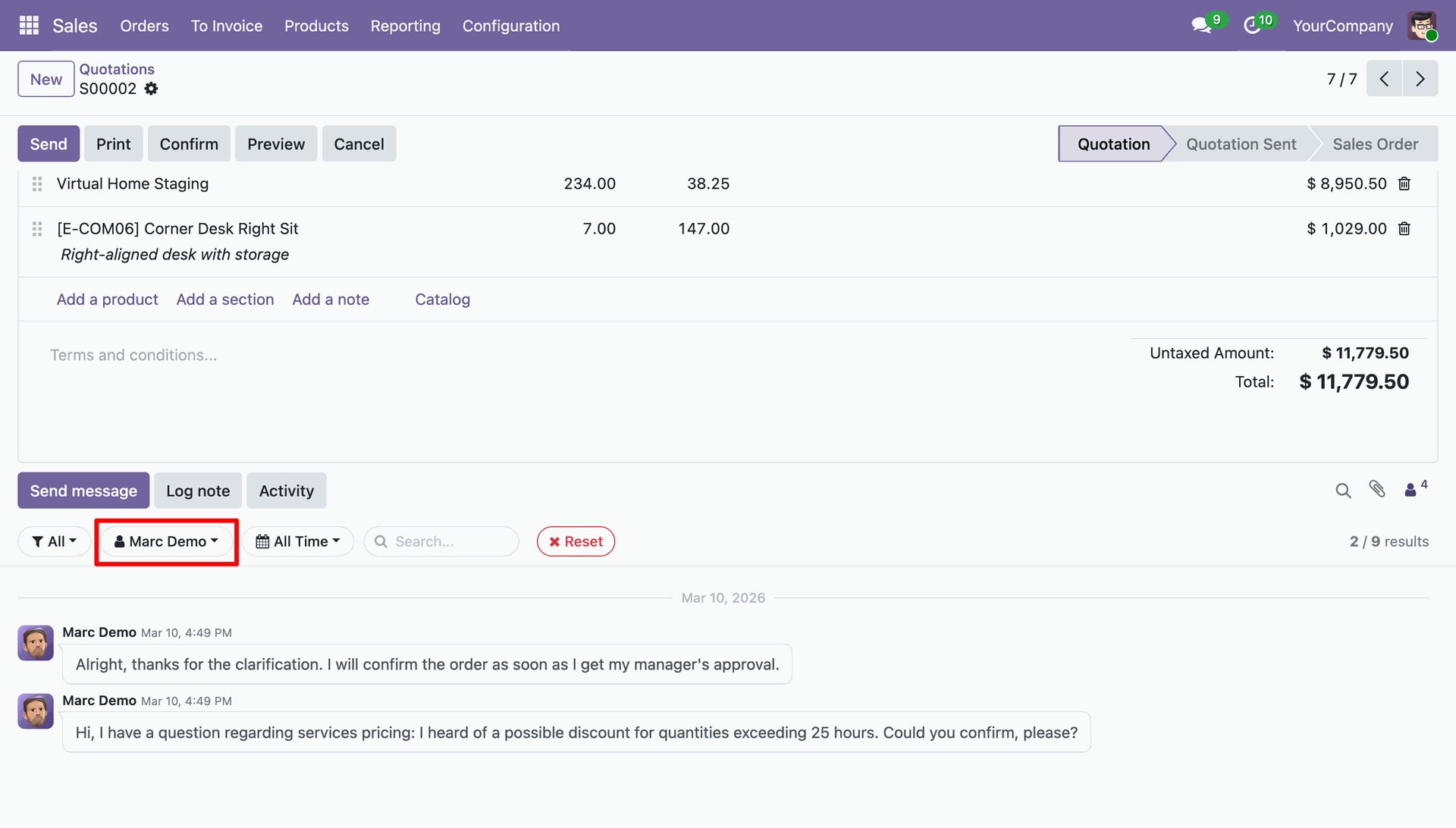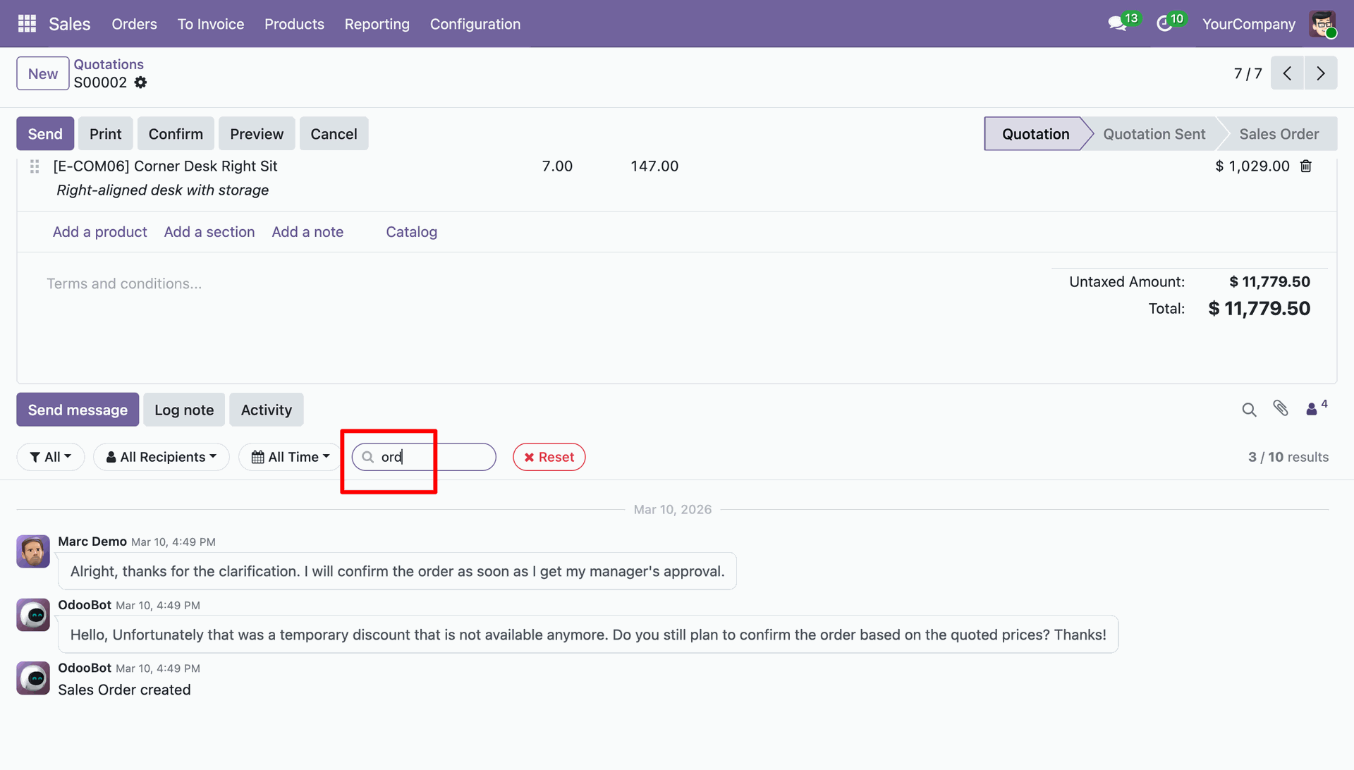 Here you can see all available filters and search tools in the chatter bar to quickly sort and find messages.