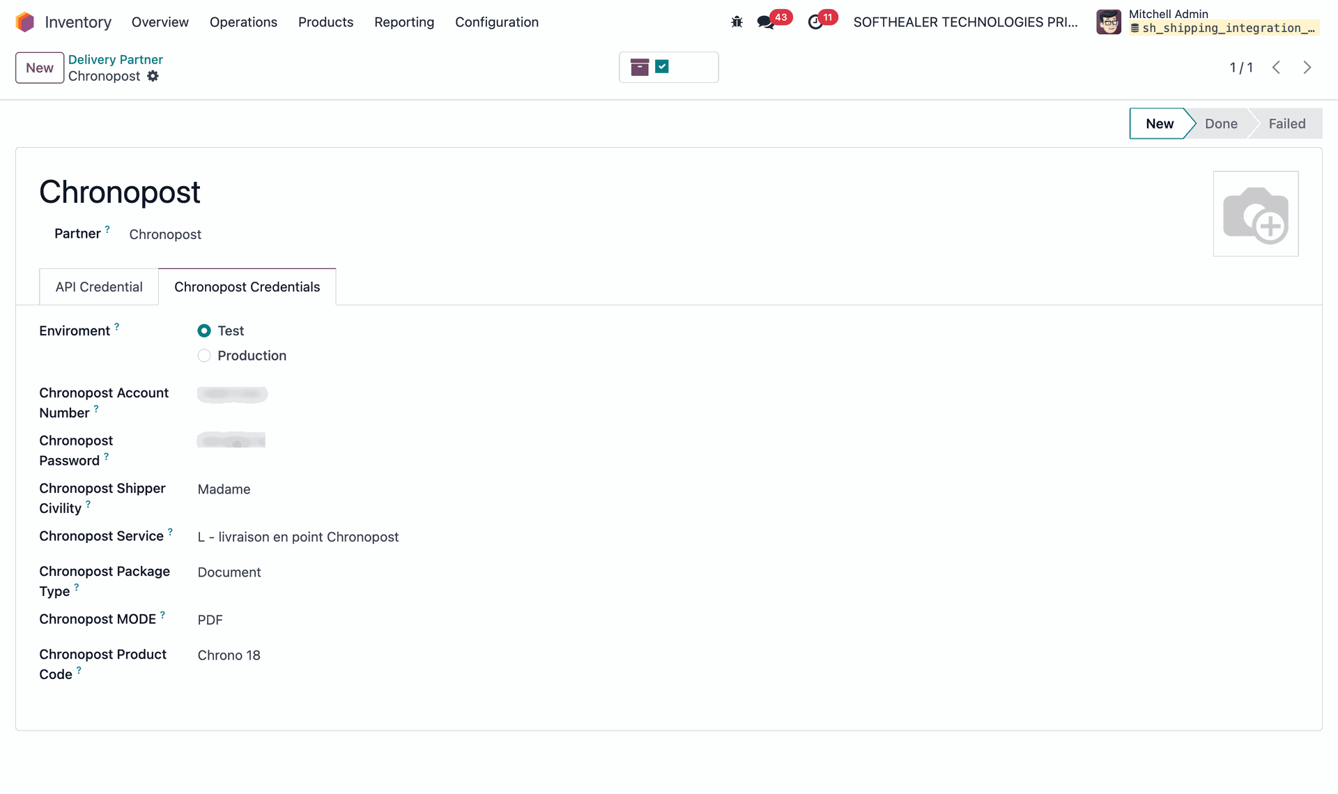 Configure the Chronopost delivery partner by entering your API credentials to establish a secure connection with Chronopost services.
