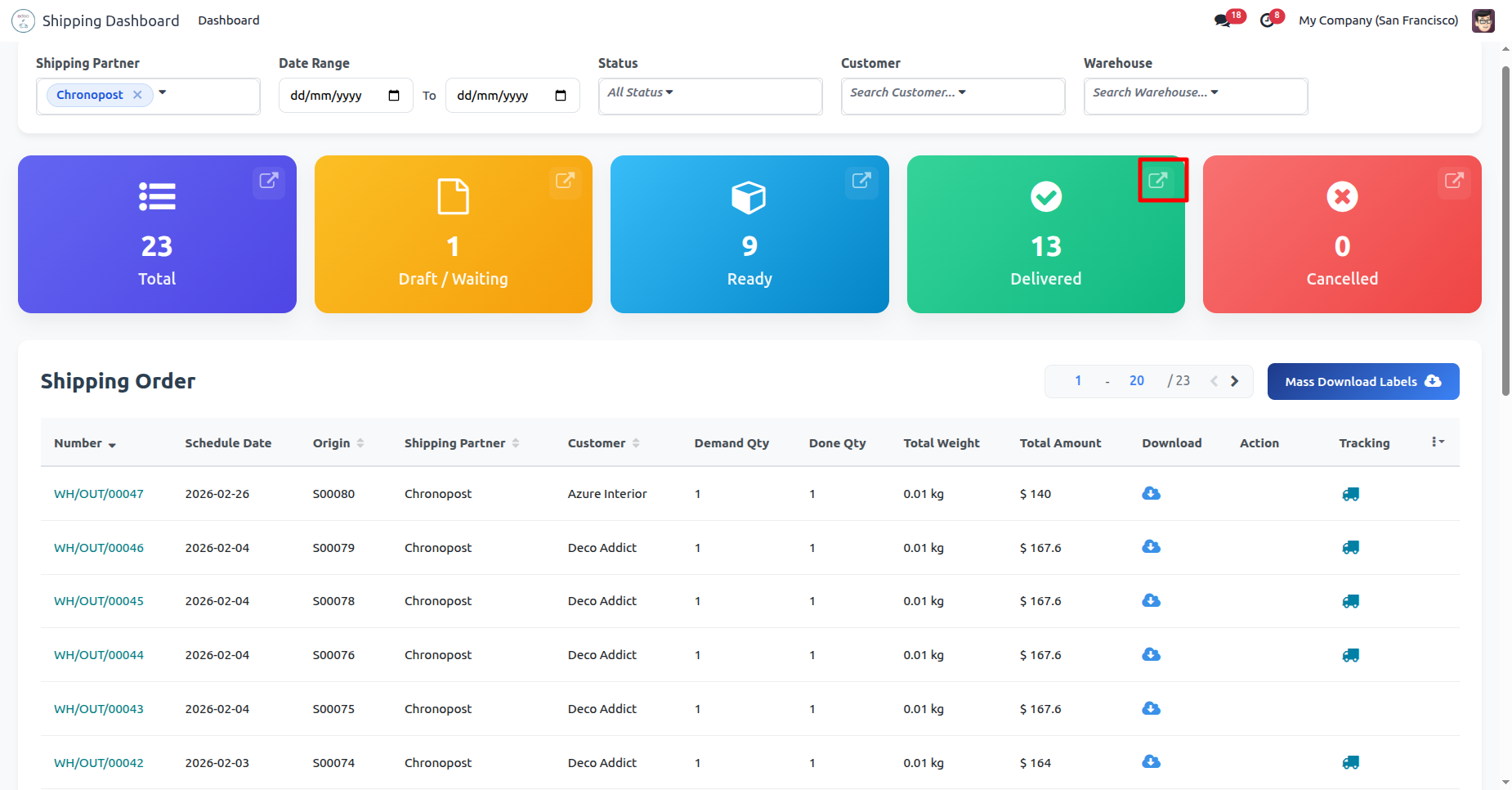 Generate multiple shipping labels in one action directly from Odoo, allowing you to process bulk delivery orders faster.
