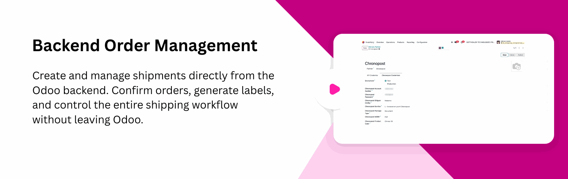 The Chronopost Shipping Integration module seamlessly connects your Odoo system with Chronopost shipping services. Users can add shipping methods, fetch accurate live rates, confirm orders, generate labels, track shipments, create return shipments, and cancel shipments directly from Odoo without switching platforms. This integration reduces manual effort, improves dispatch accuracy, and ensures a smooth, fast, and reliable order-to-shipment process for businesses of any size.