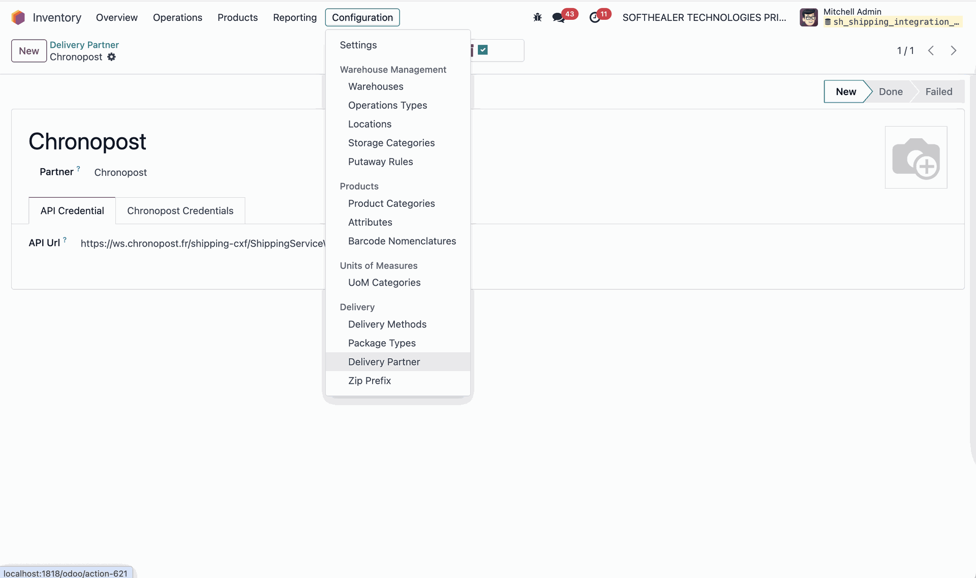 Configure the Chronopost delivery partner by entering your API credentials to establish a secure connection with Chronopost services.