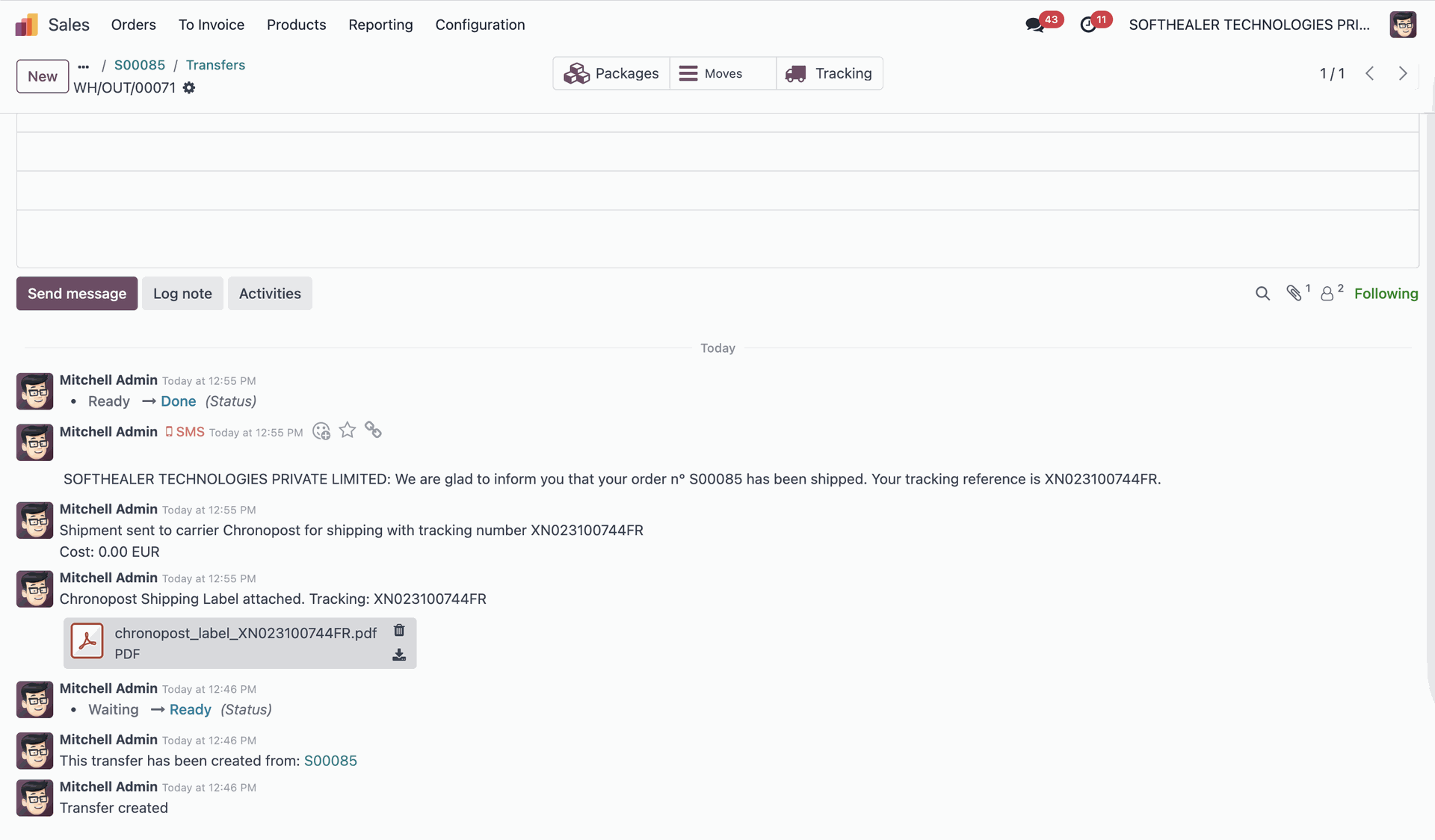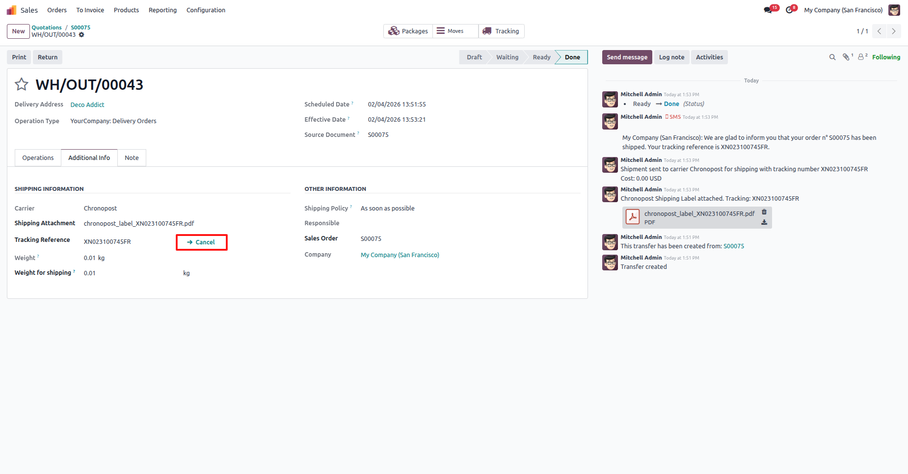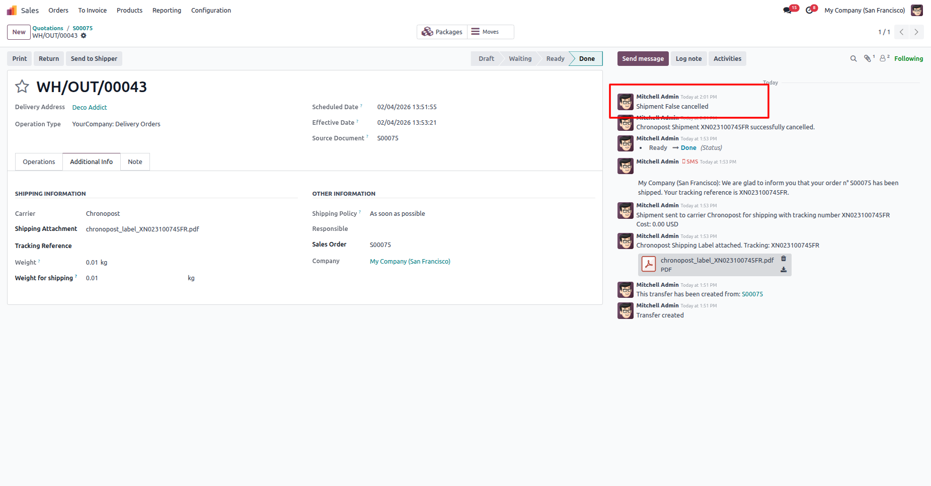 Shipment cancelled with a chatter message.