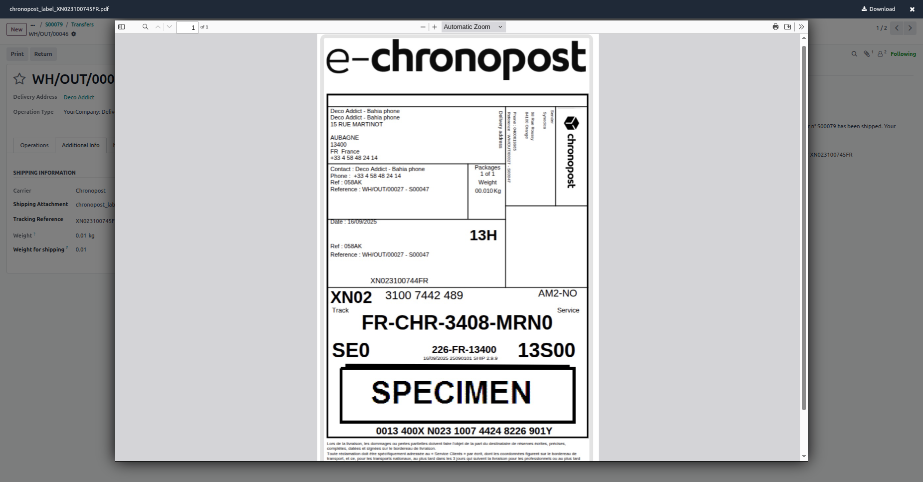 Generate multiple shipping labels in one action directly from Odoo, allowing you to process bulk delivery orders faster.