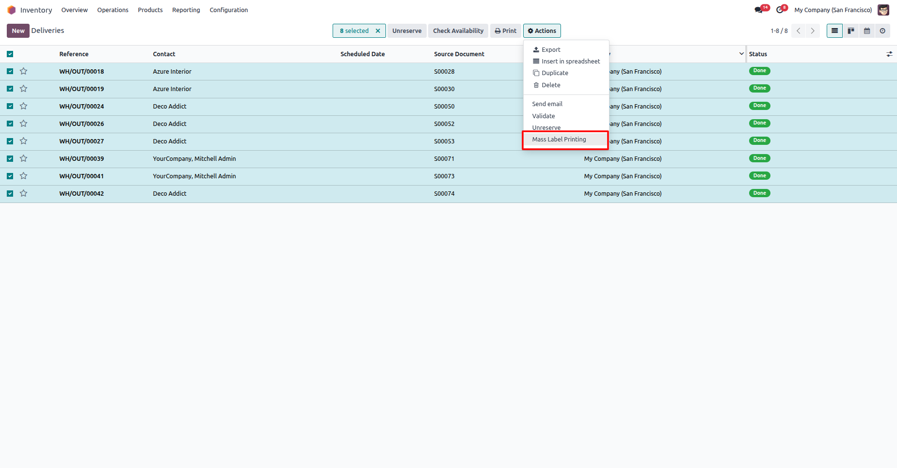 Select deliveries and click Action -> Mass Label Printing.