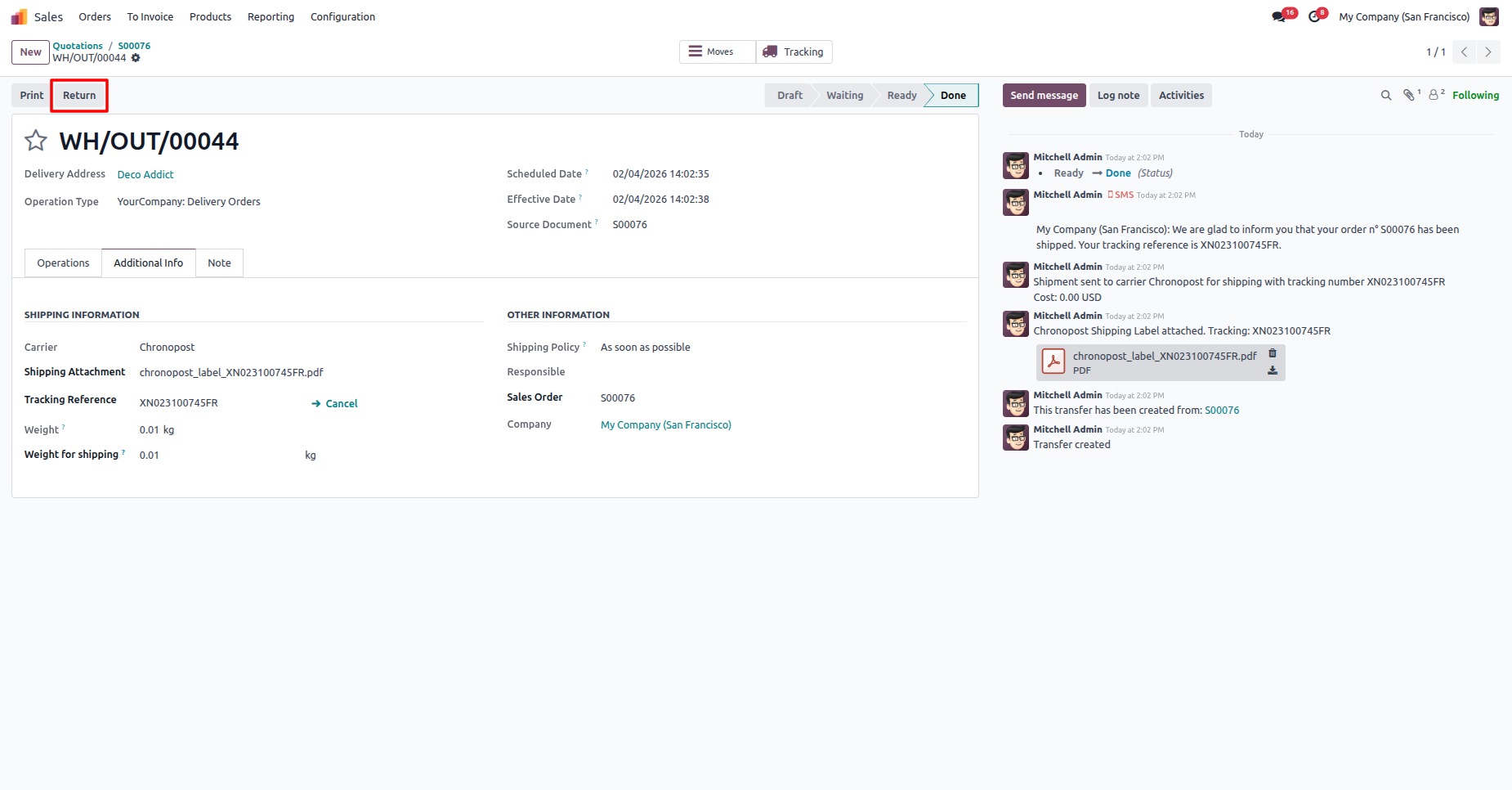Click "Return" to return the shipment.