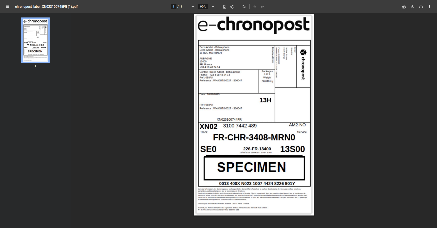 One-click label generation and download for seamless Chronopost shipment processing.