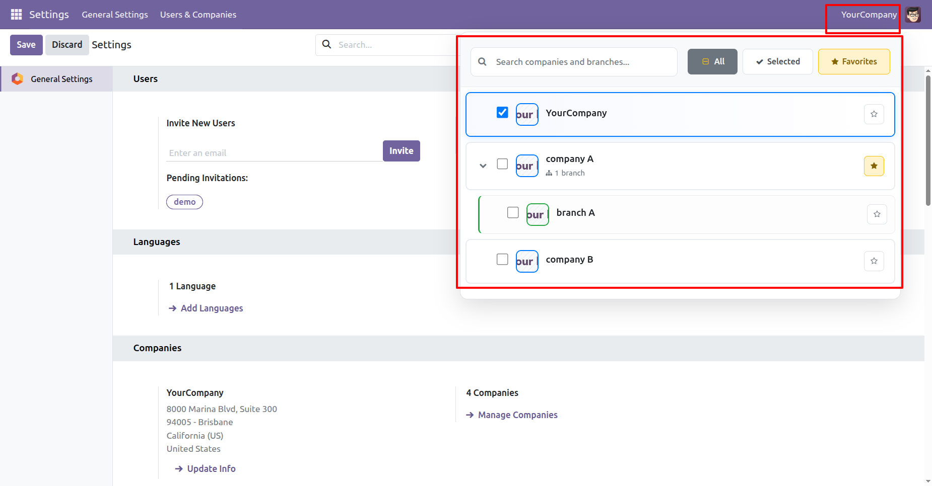 - Quickly view, search, and switch between multiple companies and their related branches directly from the Odoo top bar.