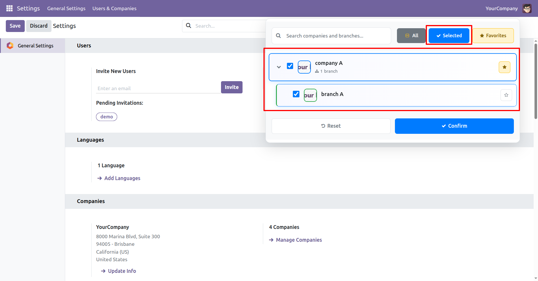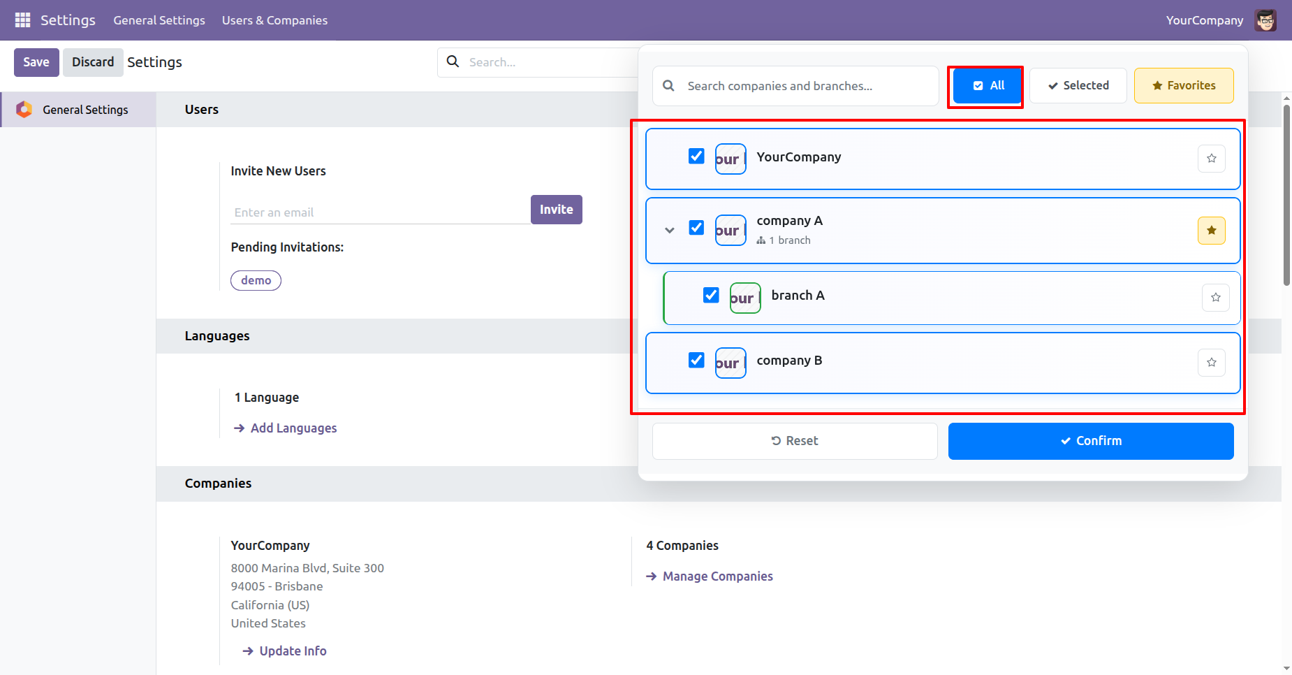 - Activate multiple companies or branches at once using simple checkboxes, and confirm selections instantly for smoother multi-company operations.