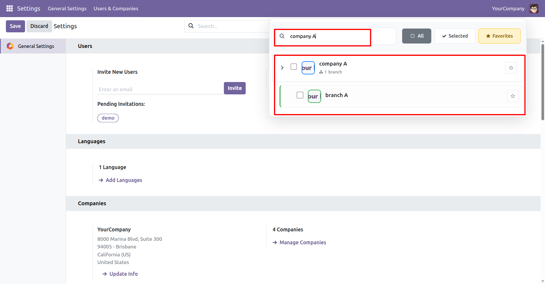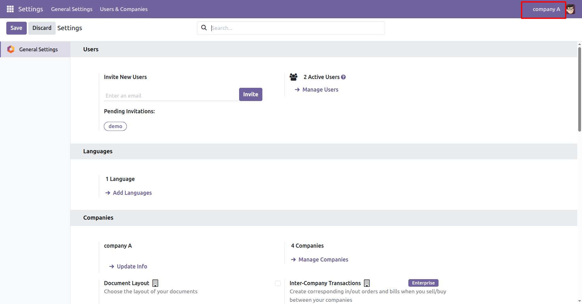- When you select a company from the dropdown, your Odoo interface automatically updates - showing data, settings, and users specific to that active company.