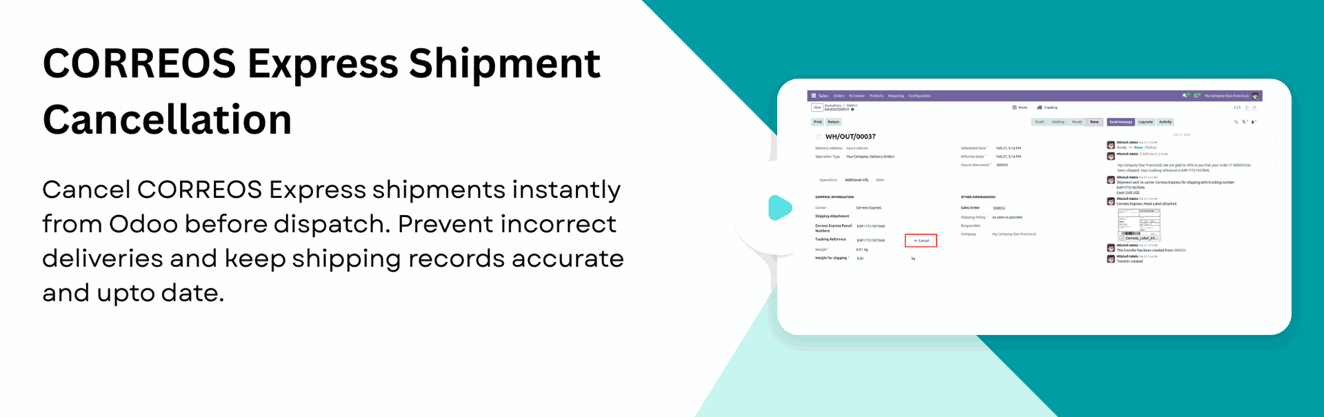Cancel CORREOS Express shipments instantly from Odoo to avoid incorrect deliveries and maintain accurate shipping records.