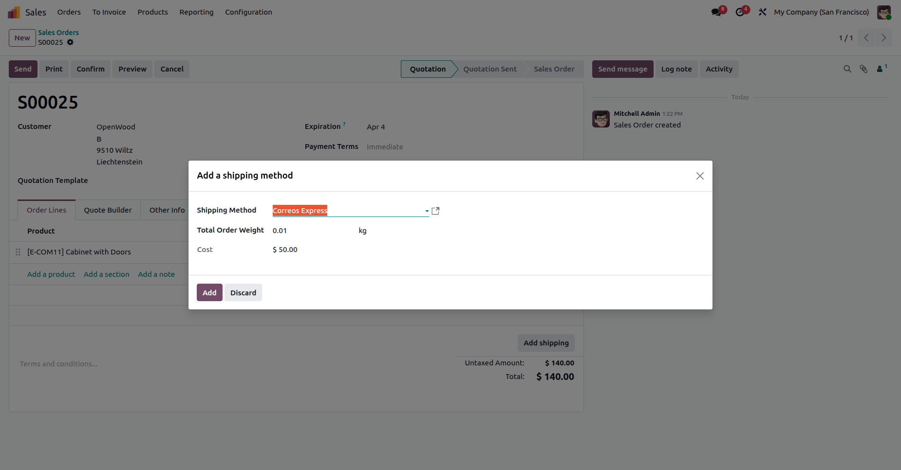Create a quotation and click on the "Add Shipping" button. After that, "Add a Shipping Method" wizard will appear. Enter the details and click on the "Add" button.